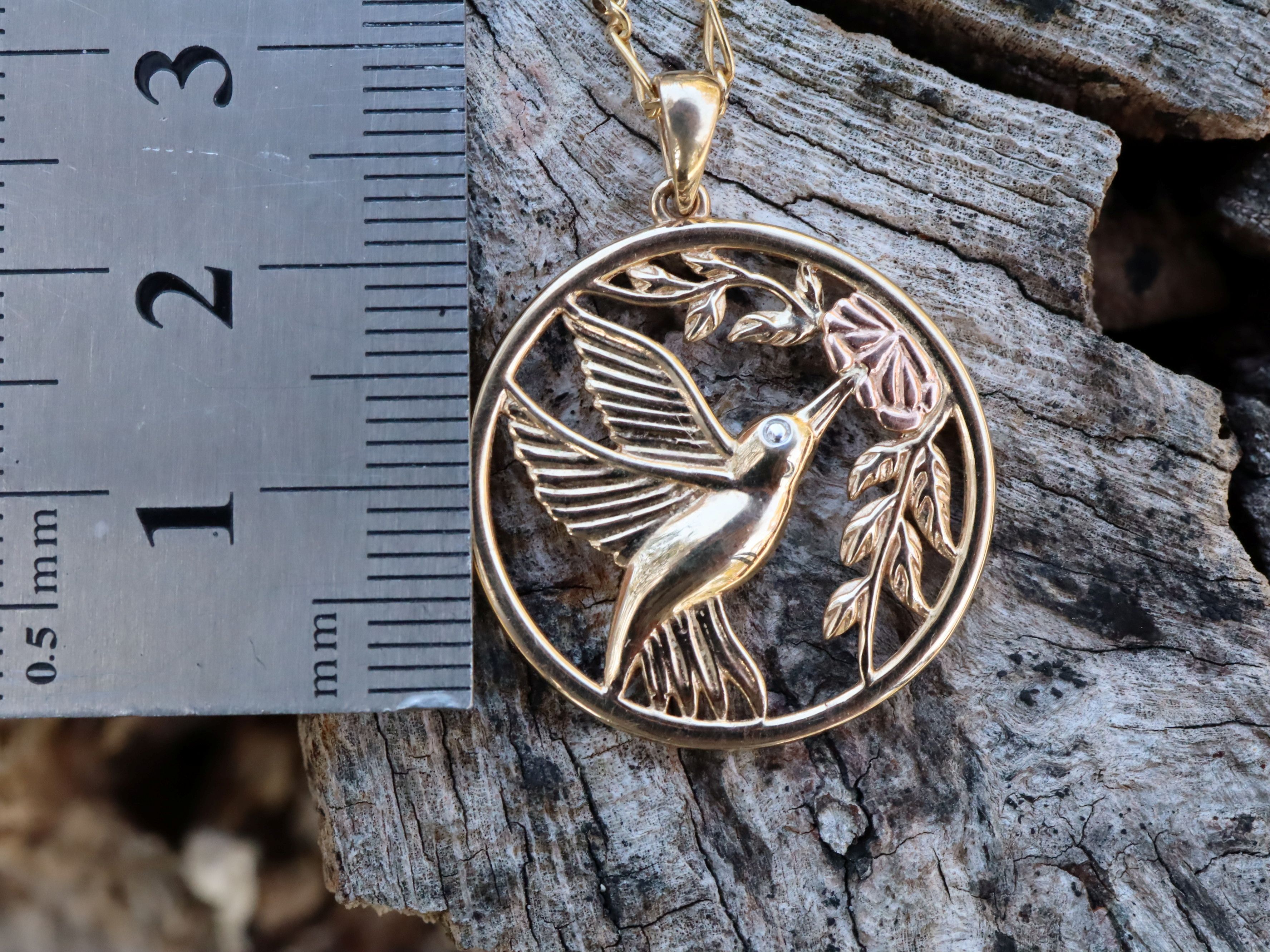 This 9ct gold pendant and chain weighs 5.64g and depicts a nectar-eating bird feeding on a hibiscus, a detailed and expressive design with strong natural charm. The chain is 55cm long and marked ITALY 375, confirming 9ct gold. The combination of the graceful bird motif and floral element gives the piece a lively, almost illustrative quality, making it a distinctive pendant that sits comfortably at a longer length.