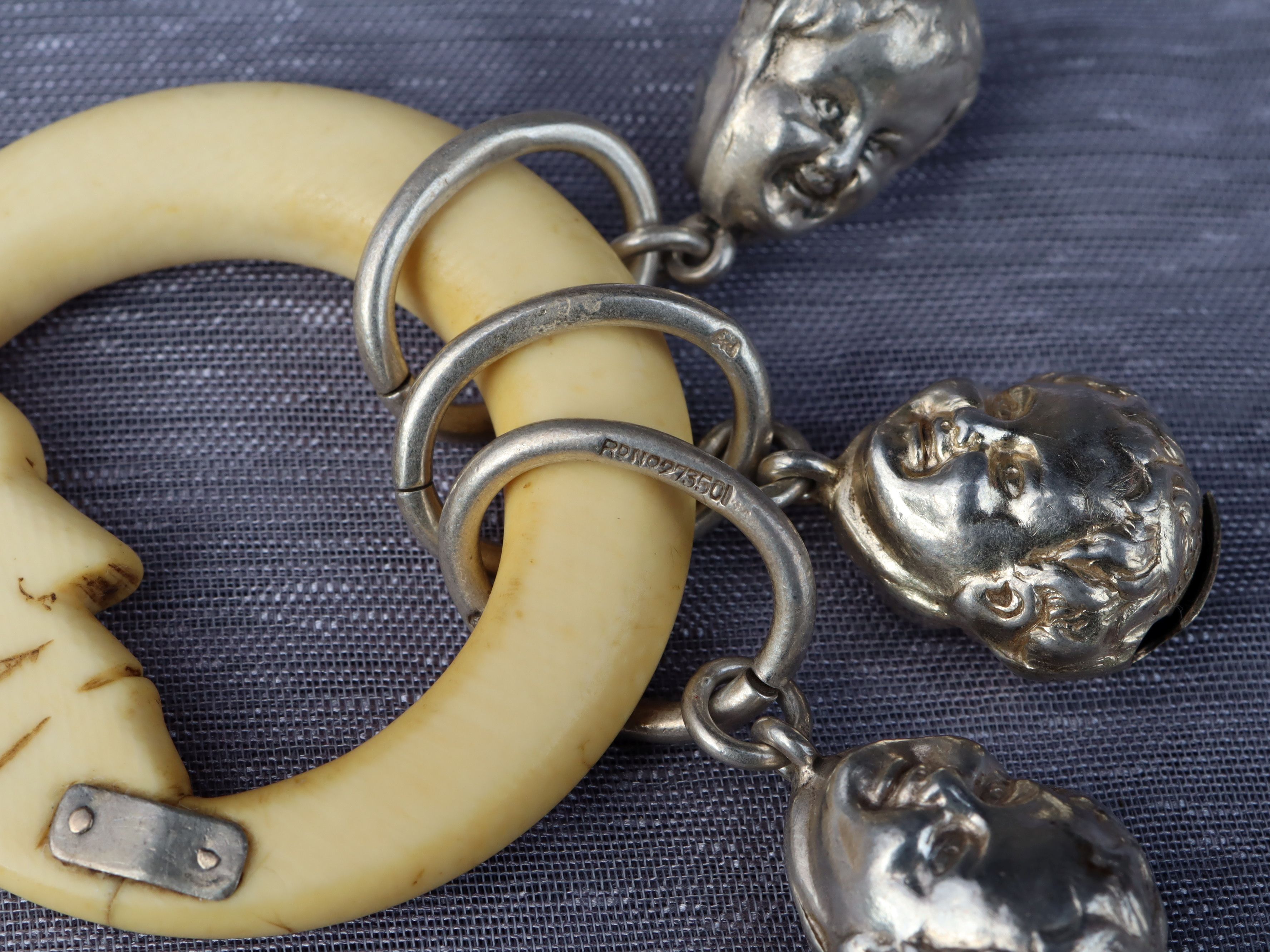 This antique baby’s rattle is made from sterling silver and ivory, hallmarked Chester 1895, and weighs 35.38g. The ivory section is 5cm in diameter and is carved with an expressive “man in the moon” face. It was made by Cornelius Saunders and James Francis, a respected Chester partnership active in the late 19th century and well known for high-quality small silver wares, particularly christening gifts such as rattles, whistles, and teething rings. Their work is noted for crisp casting, playful yet refined motifs, and careful finishing, making surviving examples both collectible and historically interesting today.