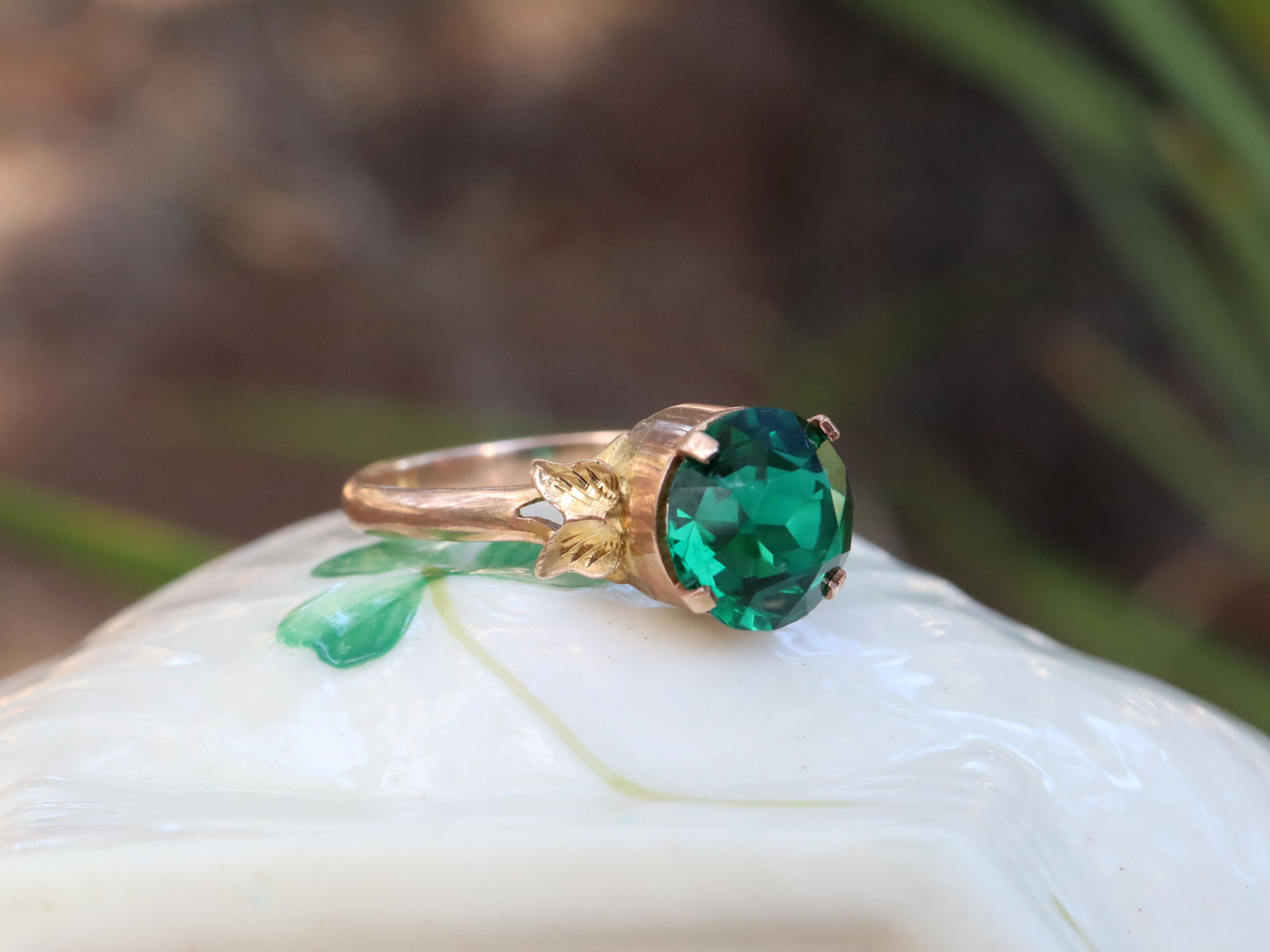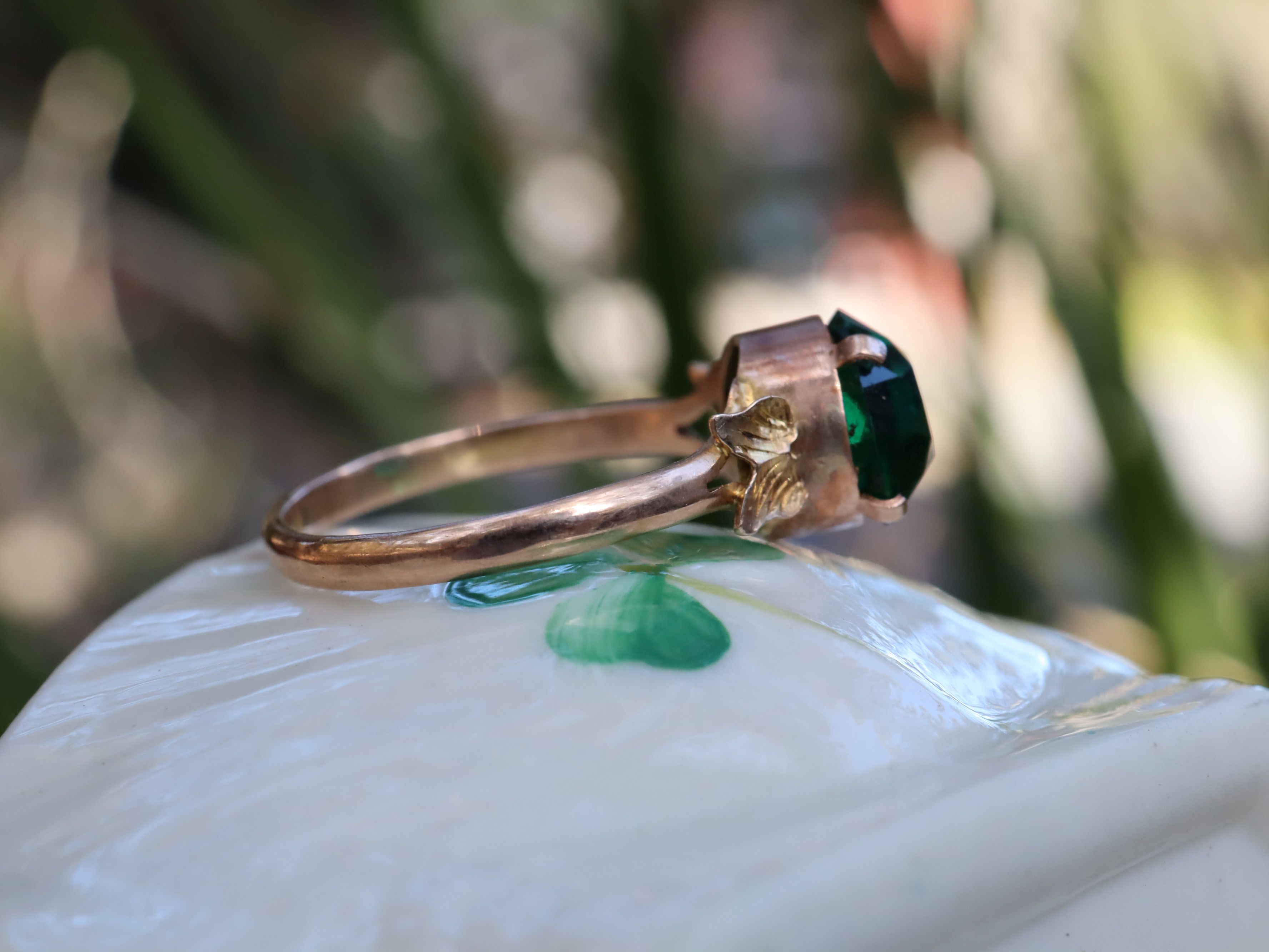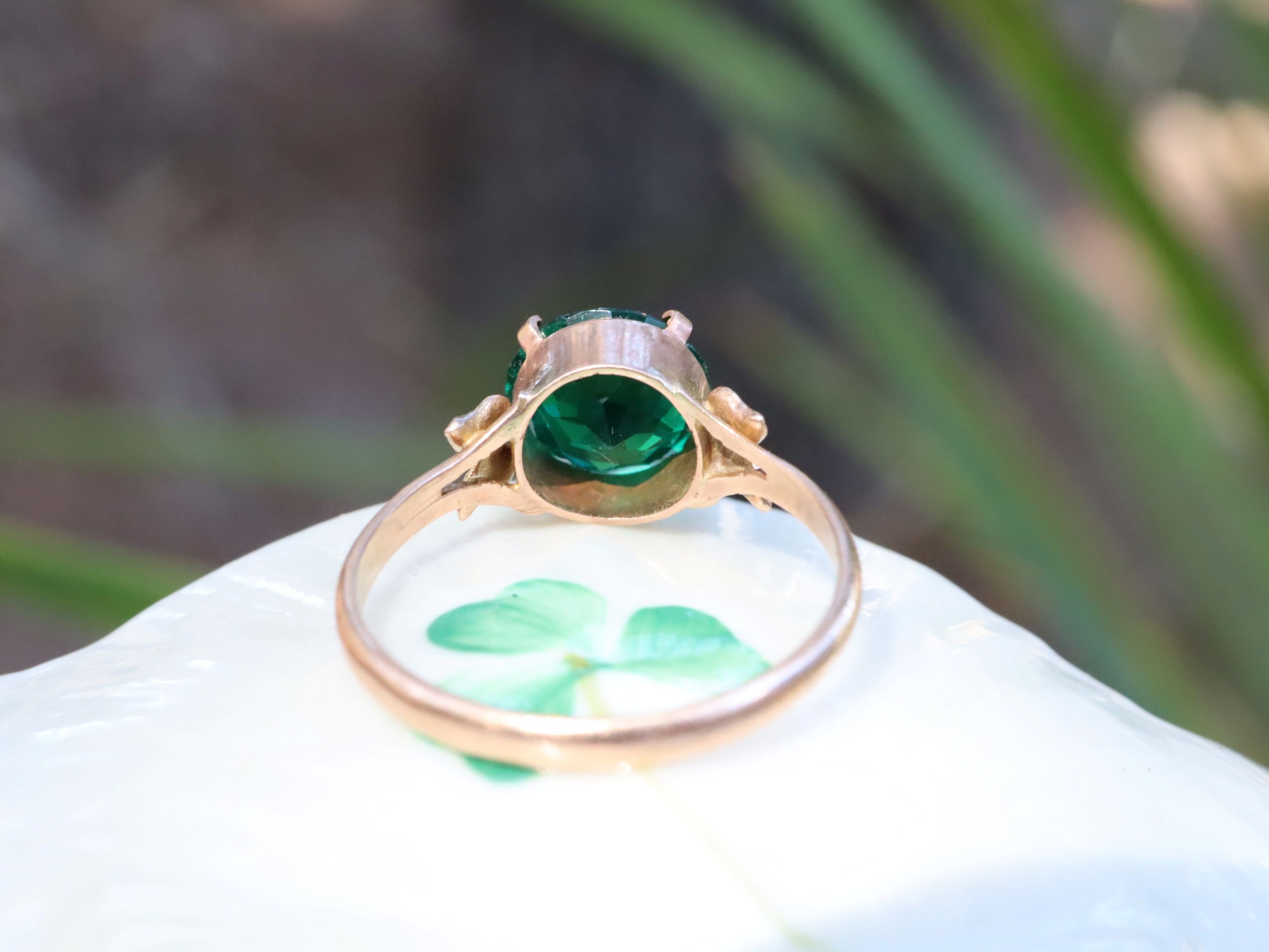 This antique green paste ring in 9ct rose gold dates to around 1930 and is size M 1/4, weighing 1.64g with an 8mm paste stone at the centre. The shoulders are delicately decorated with a motif that could be read as angel wings, butterflies, or stylised leaves, leaving the interpretation open and adding to the charm of the design. The warm rose gold setting and softly coloured paste give the ring a gentle vintage presence typical of early 20th-century jewellery.