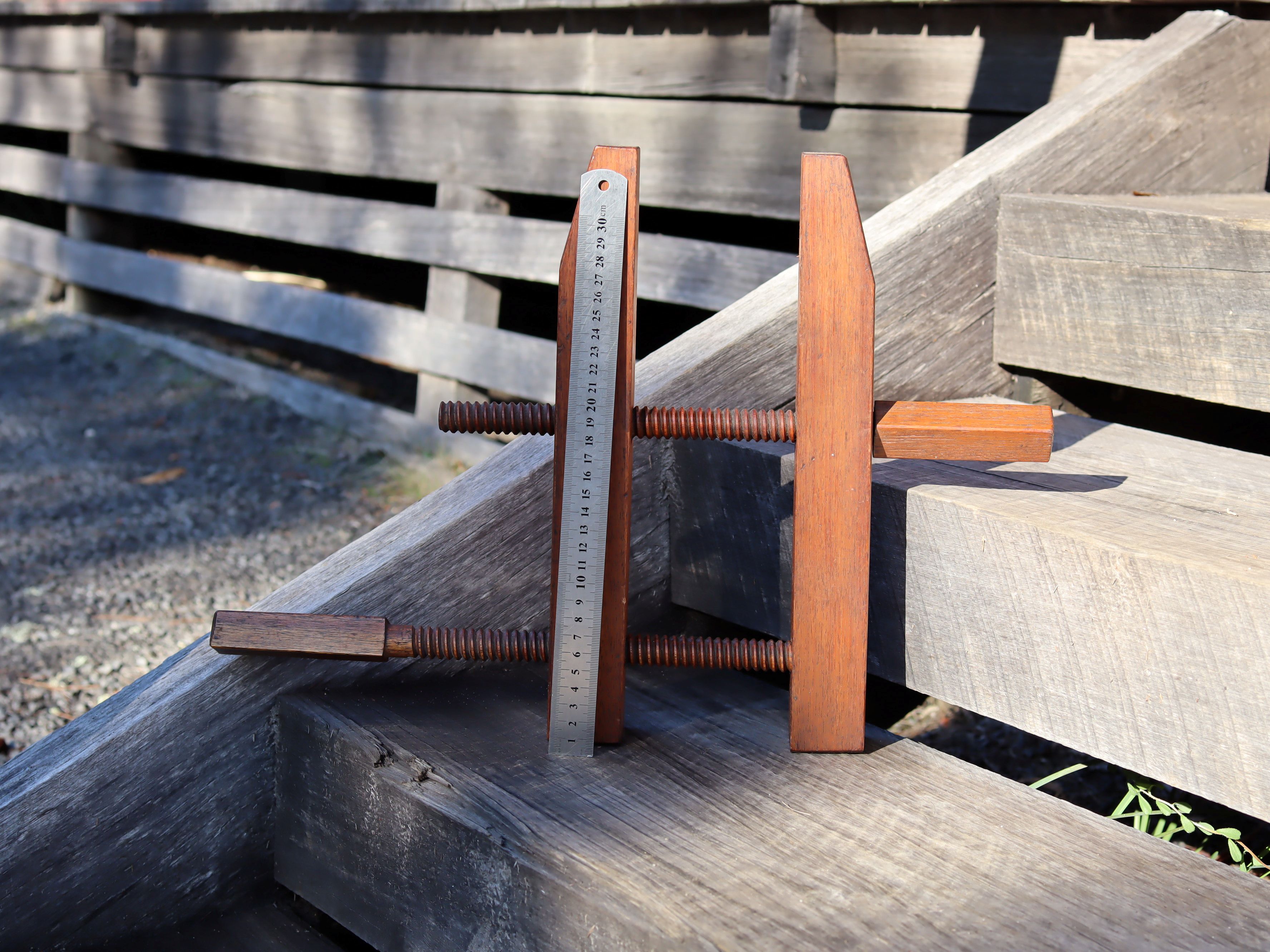 Antique woodshop clamp, 34cm long, with a lovely aged patina. A solid and functional piece of early workshop equipment, full of character. Priced at $95 in store and $110 online to allow for additional postage costs.