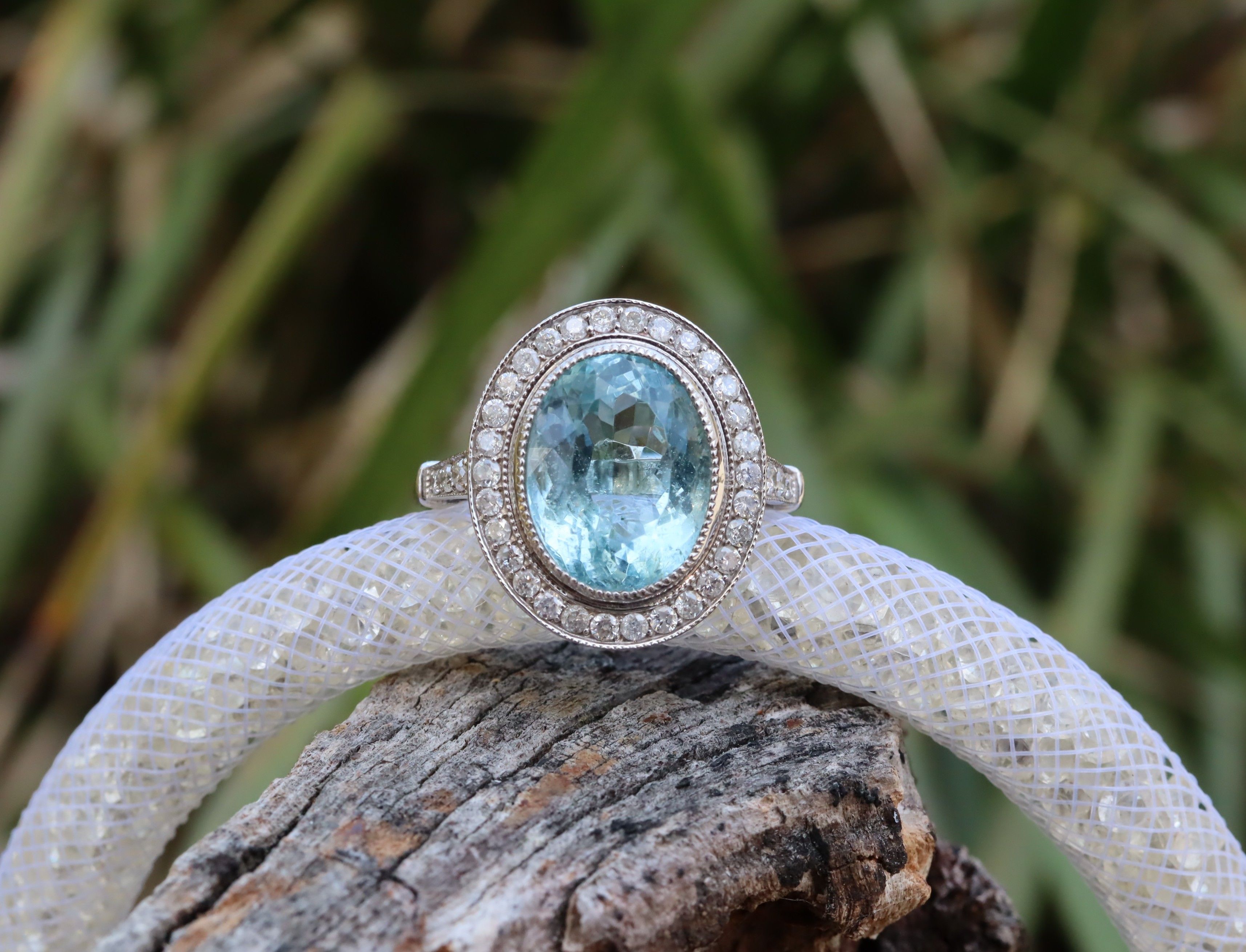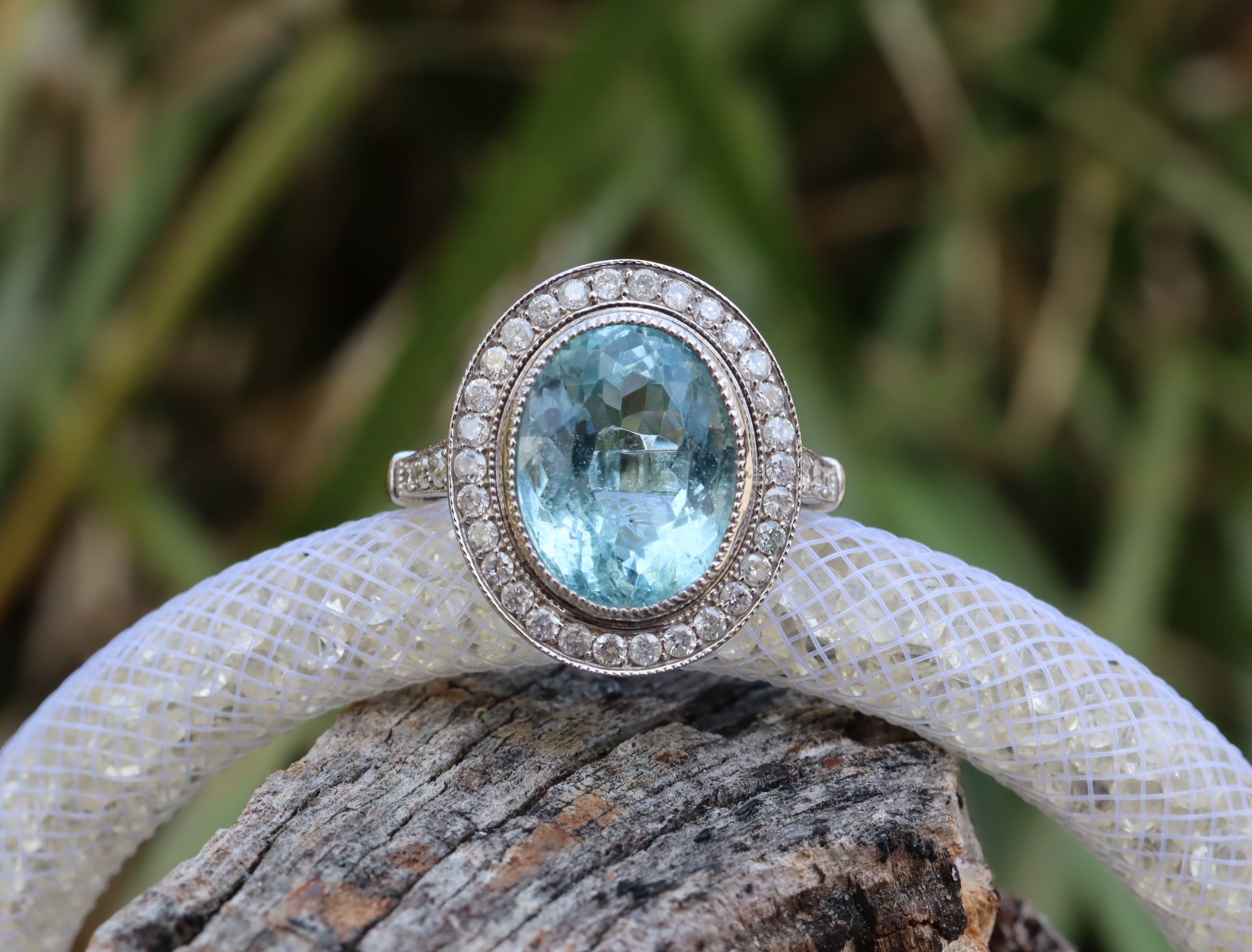 This aquamarine and diamond ring in 14ct white gold is size O and set with a substantial 4.48ct aquamarine, accented by diamonds with a total weight of 0.45ct. The design is a popular classic style that allows the luminous blue of the aquamarine to take centre stage, with the diamonds adding balance and brightness without overwhelming the stone. A retail replacement valuation dated December 2022 places its value at $8,790. It is a stunner with strong visual impact.