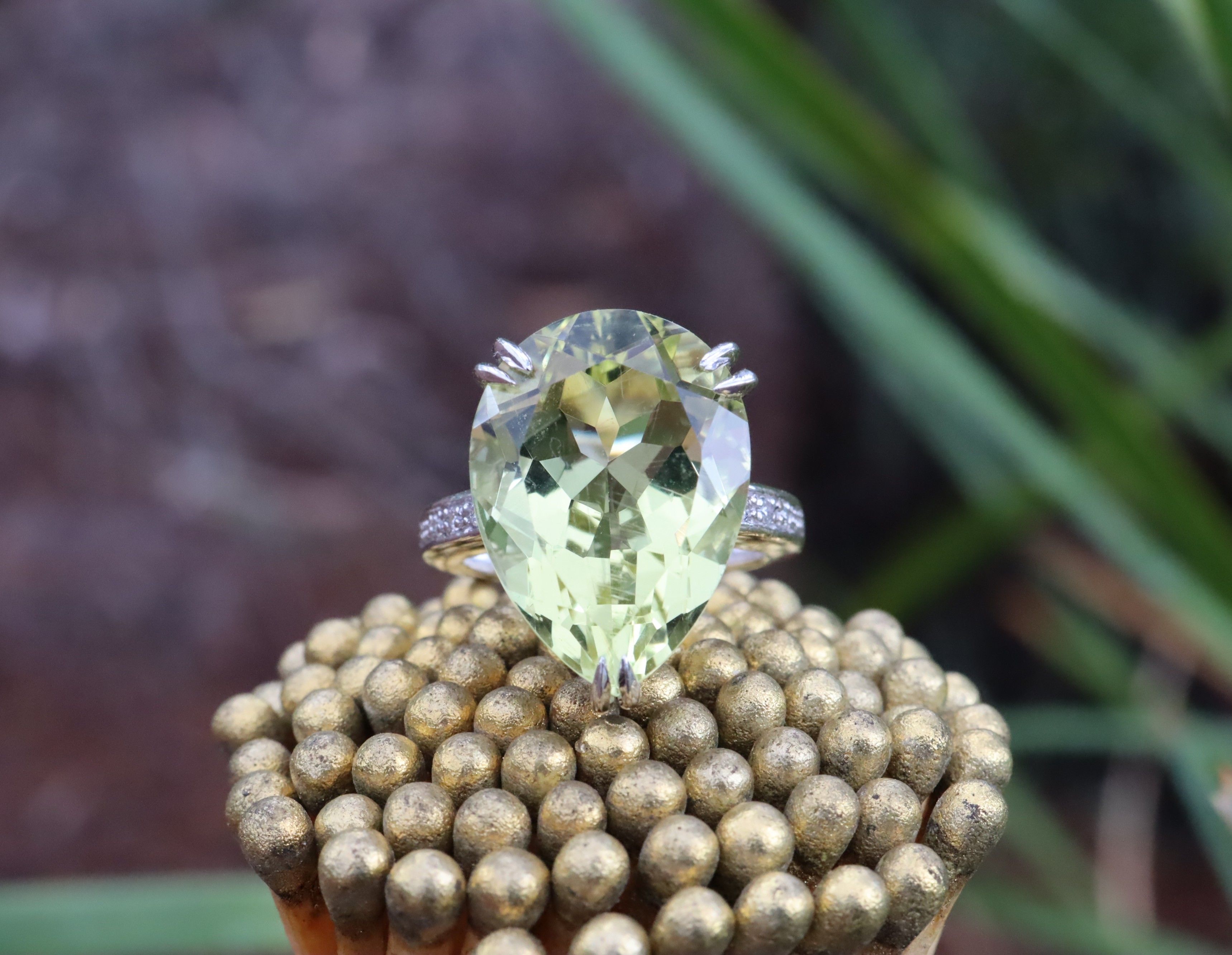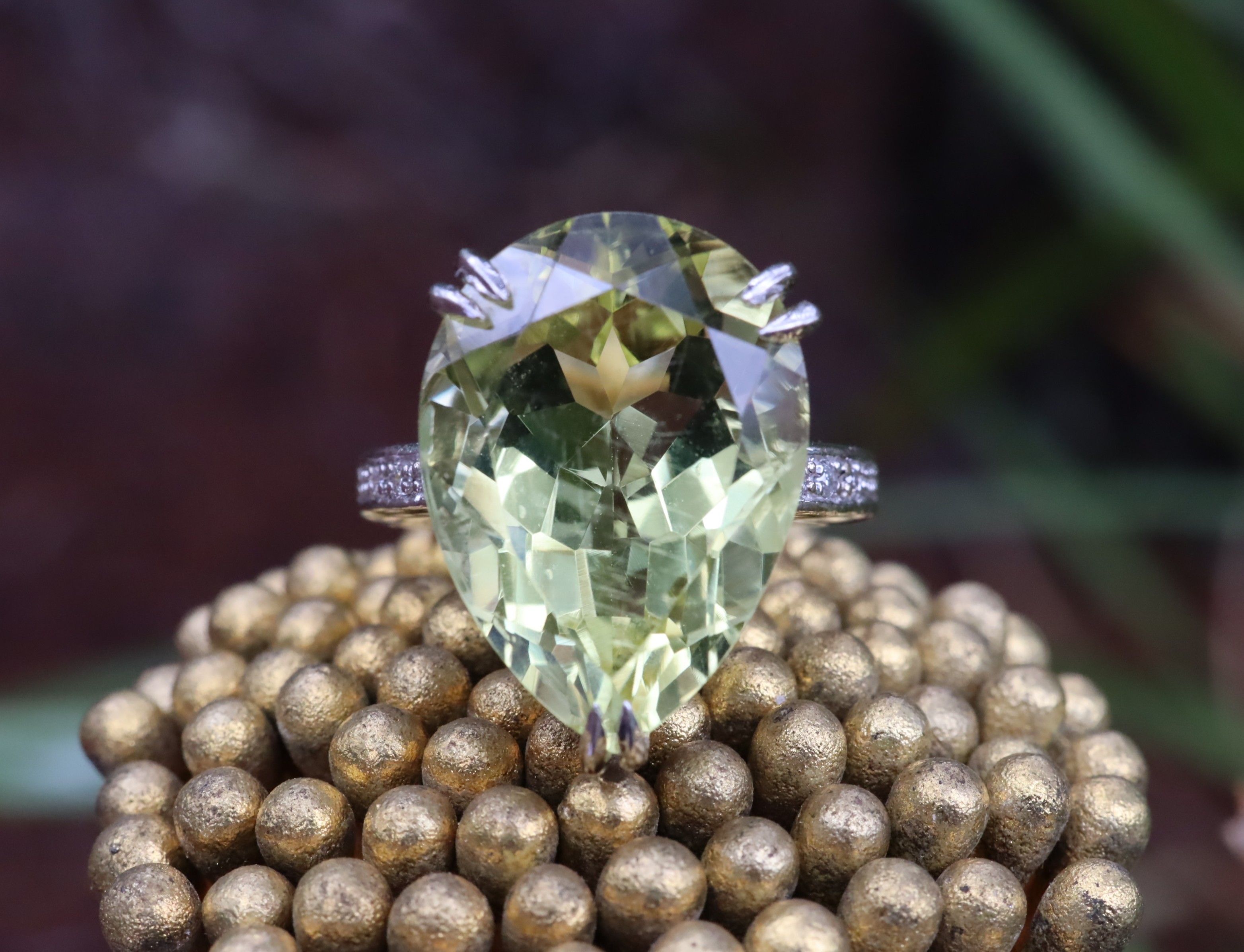 This 14ct white gold ring is a small size I, weighs 6.17 g, and holds a very large pear-cut citrine of approximately 10.00 ct, supported by six single-cut diamonds with a combined weight of about 0.03 ct. The scale of the citrine gives it an impressive presence. The diamonds add a light shimmer along the shoulder line, allowing the vivid golden stone to remain the focal point. This is a bold and confident statement piece for anyone who enjoys the drama of a substantial gemstone.