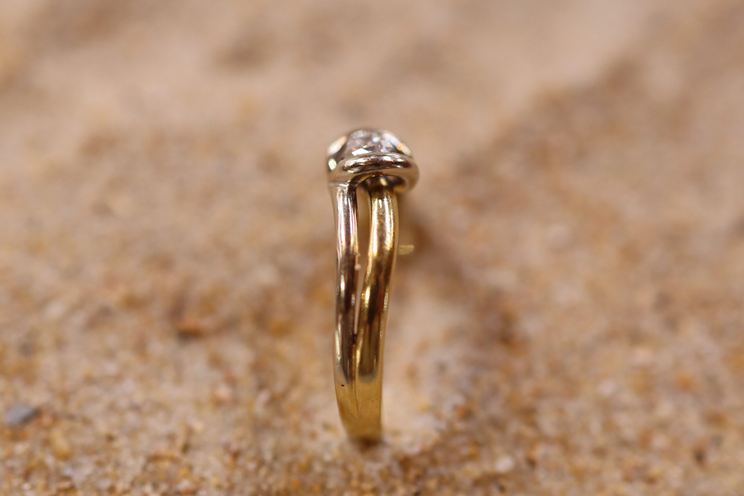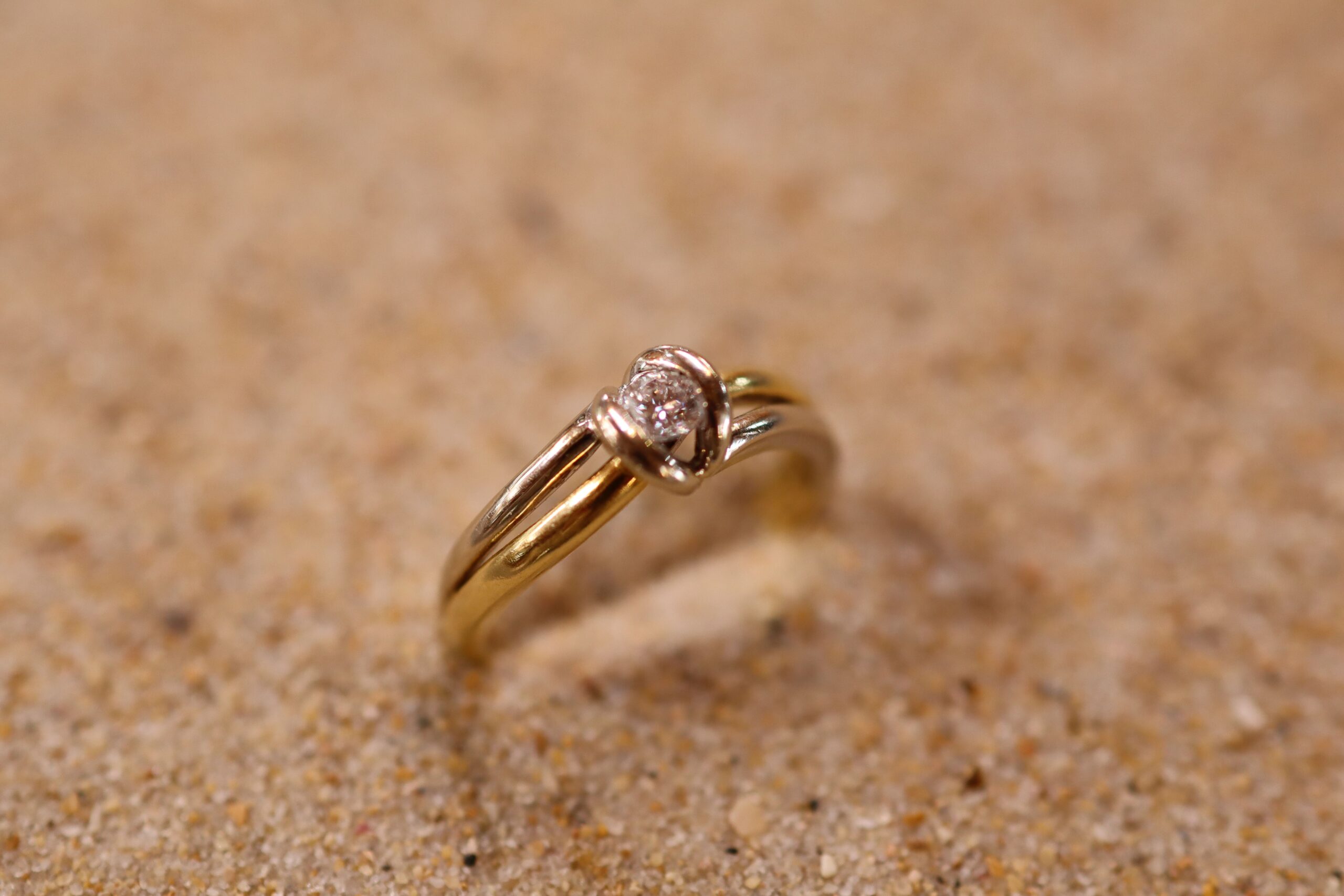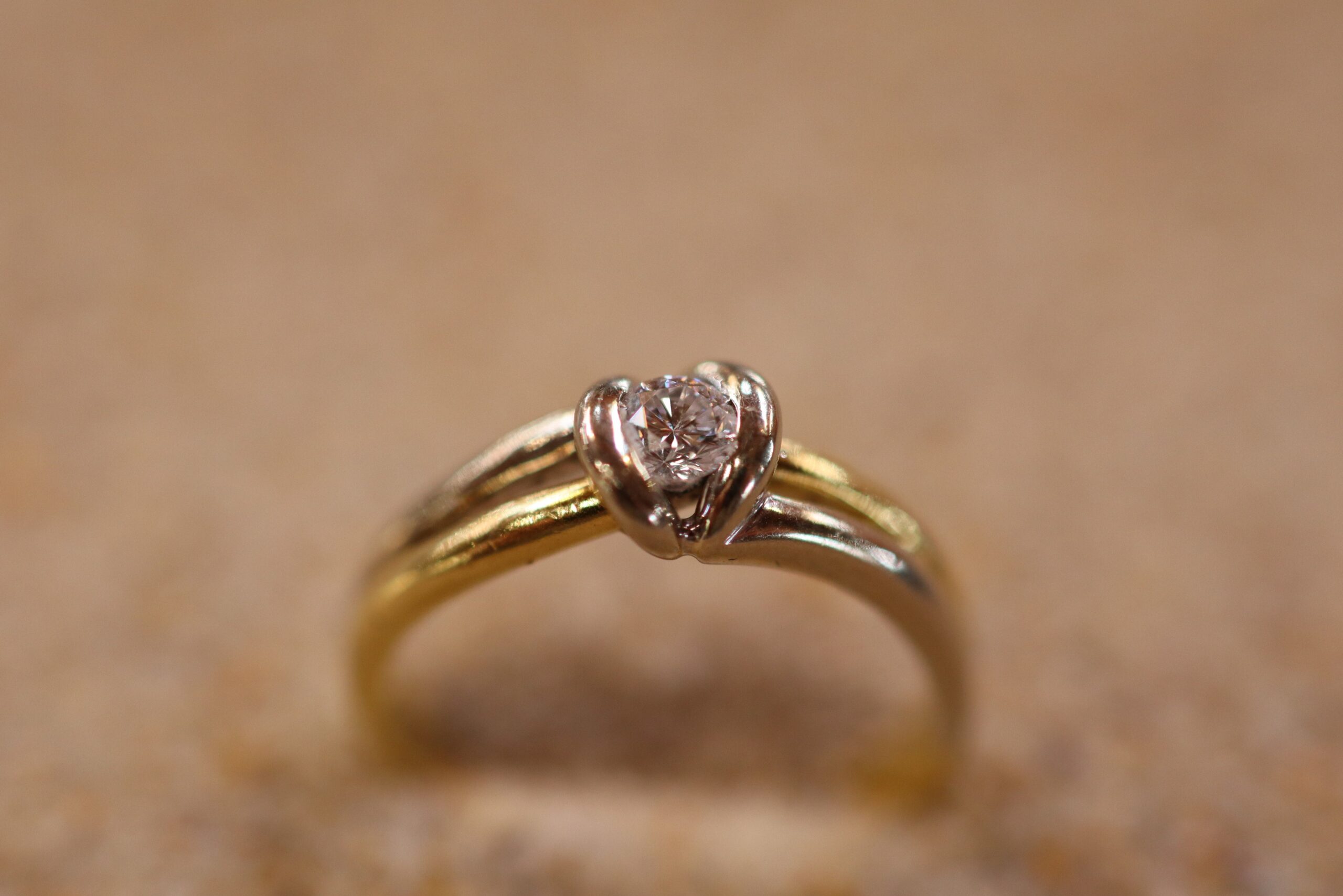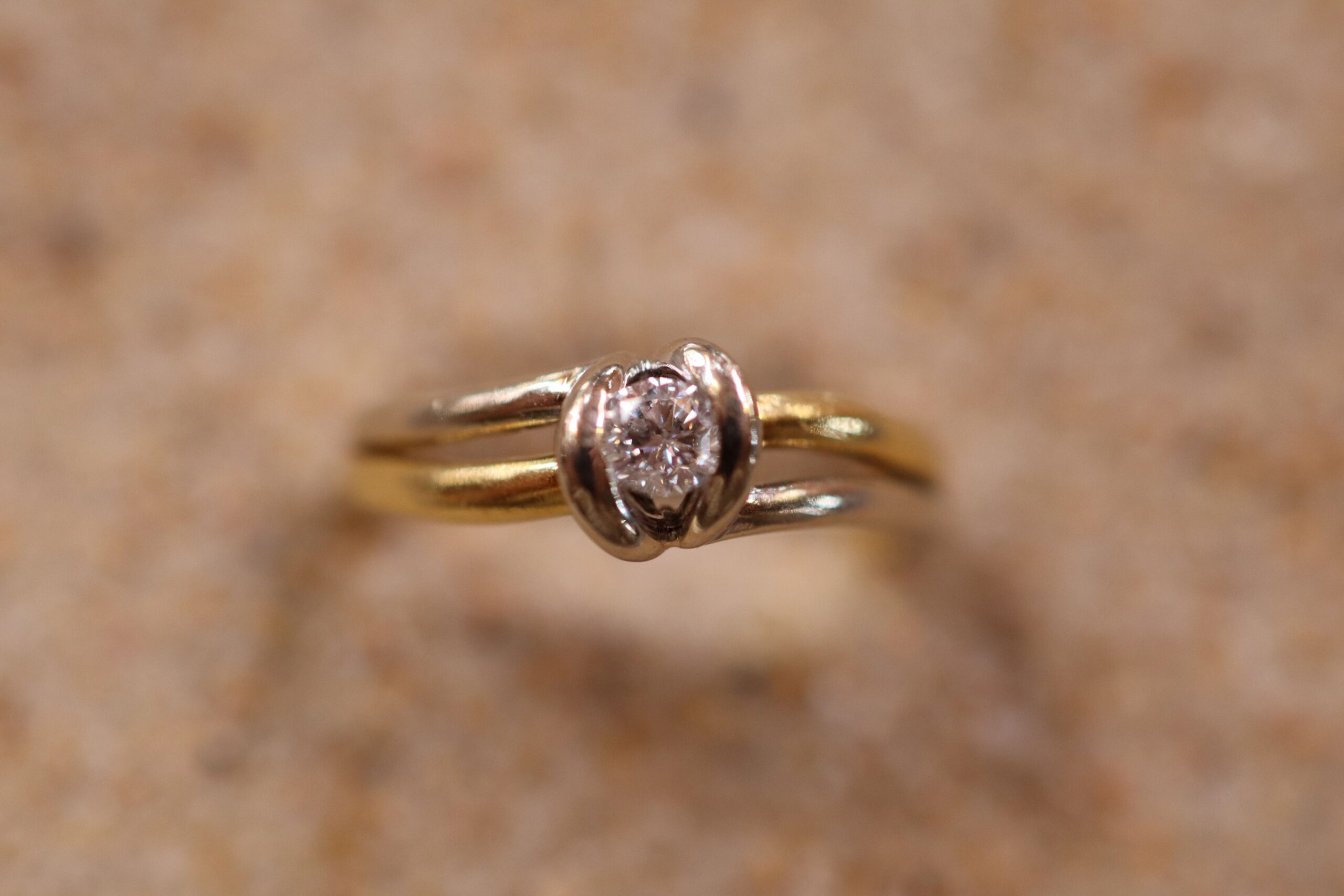 This Diamond Engagement Ring is set in 18ct Gold. It is a larger size S. It features two-tone gold; mostly yellow gold with white gold. The diamond diameter is 3mm, and the piece weighs 5.40g.