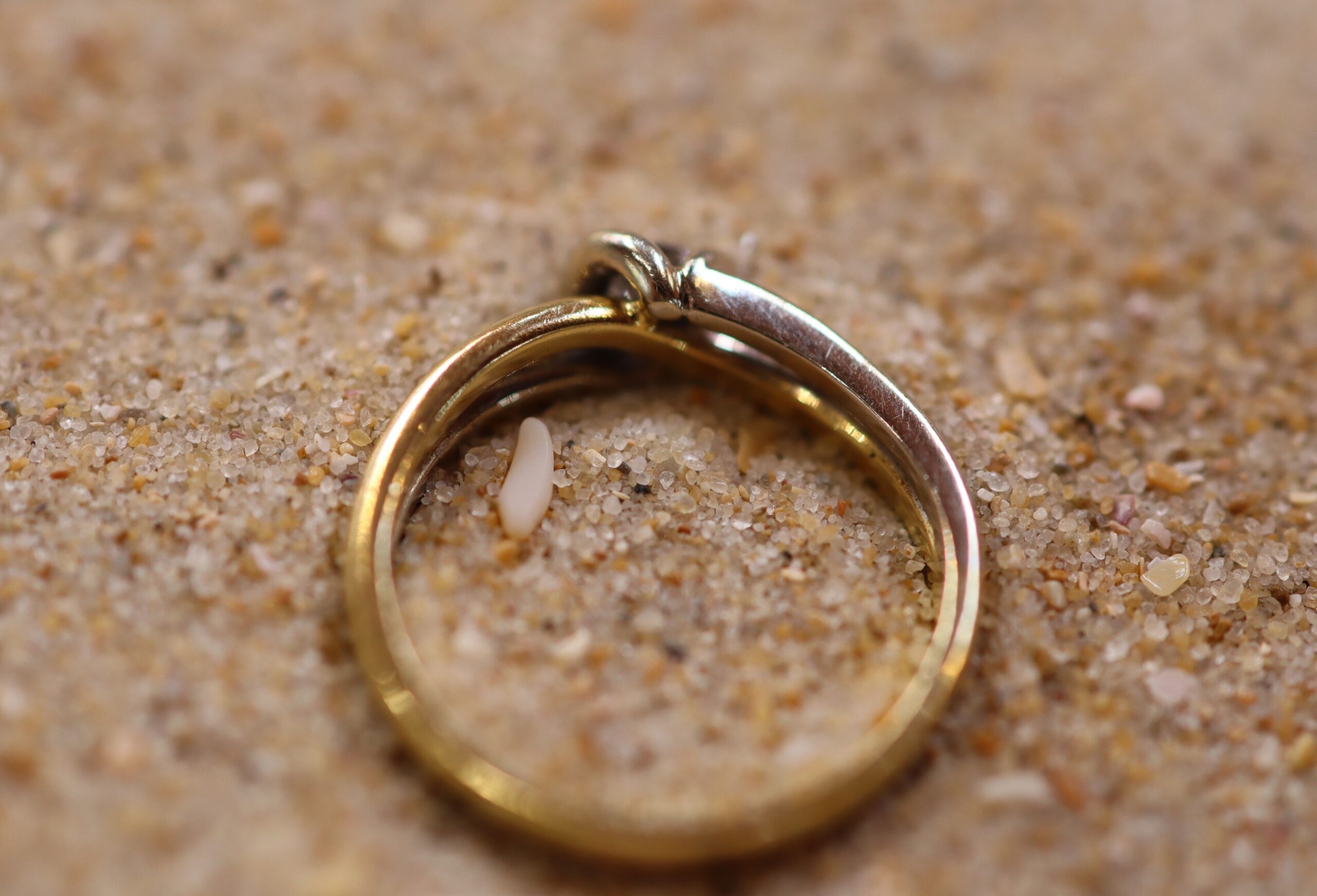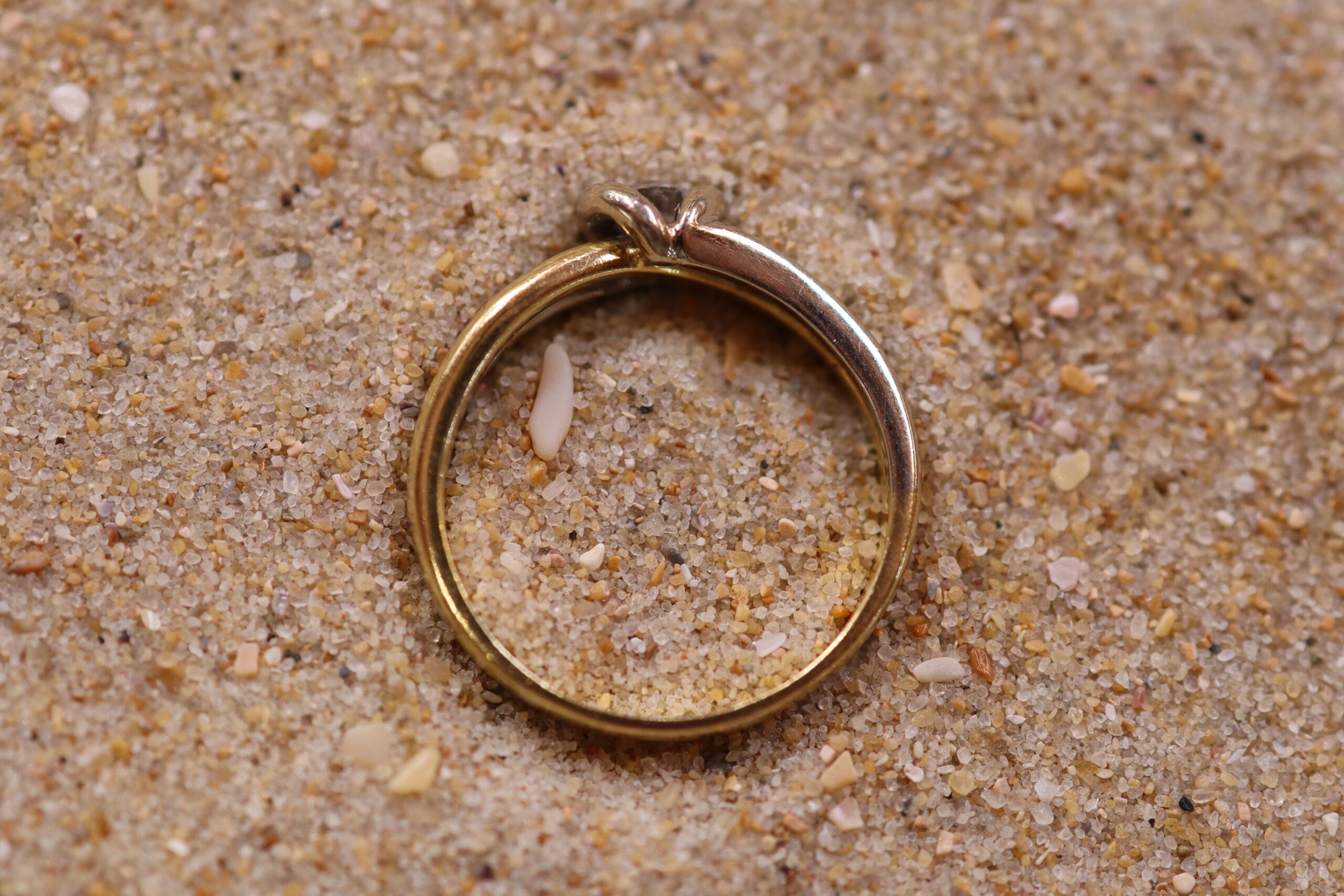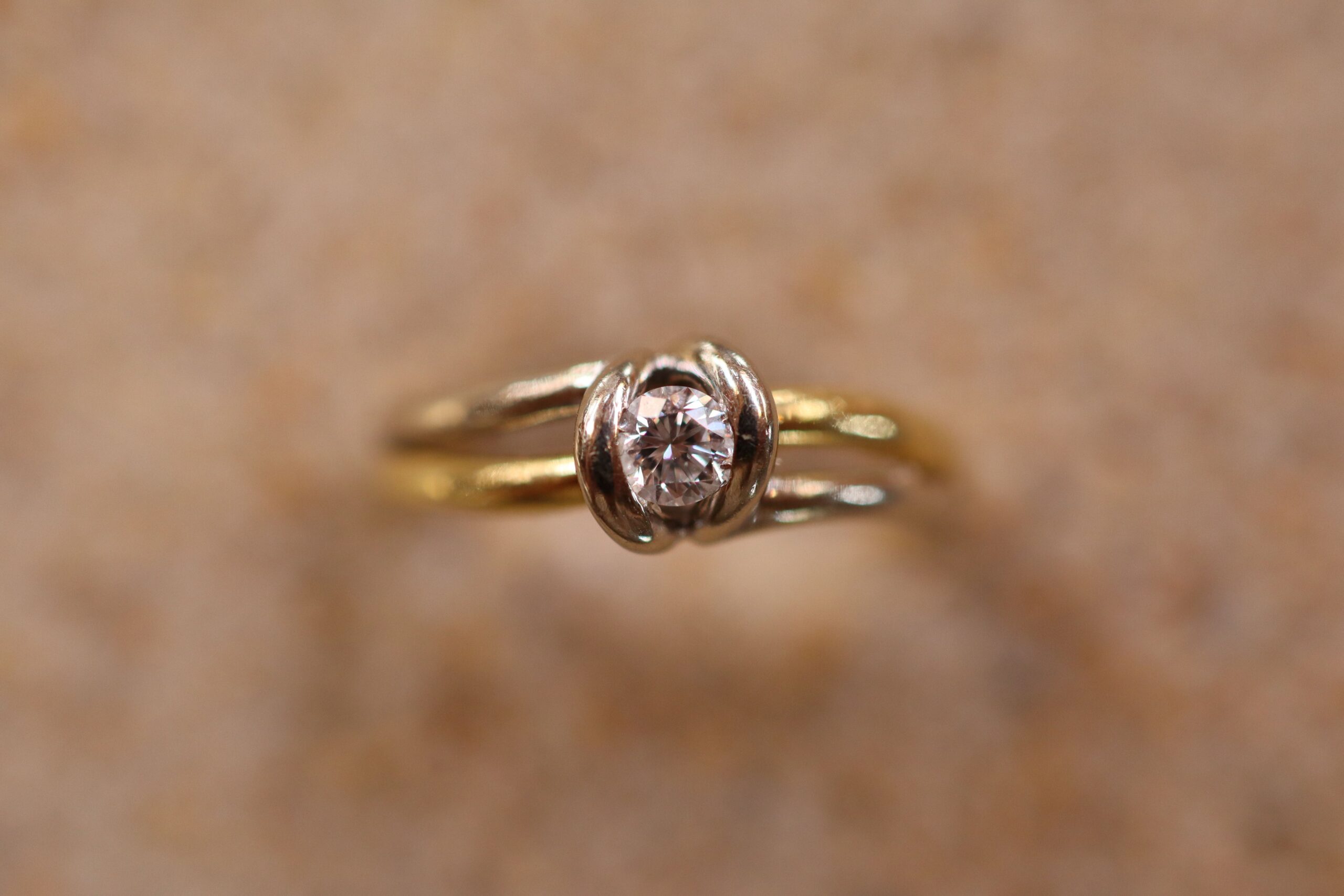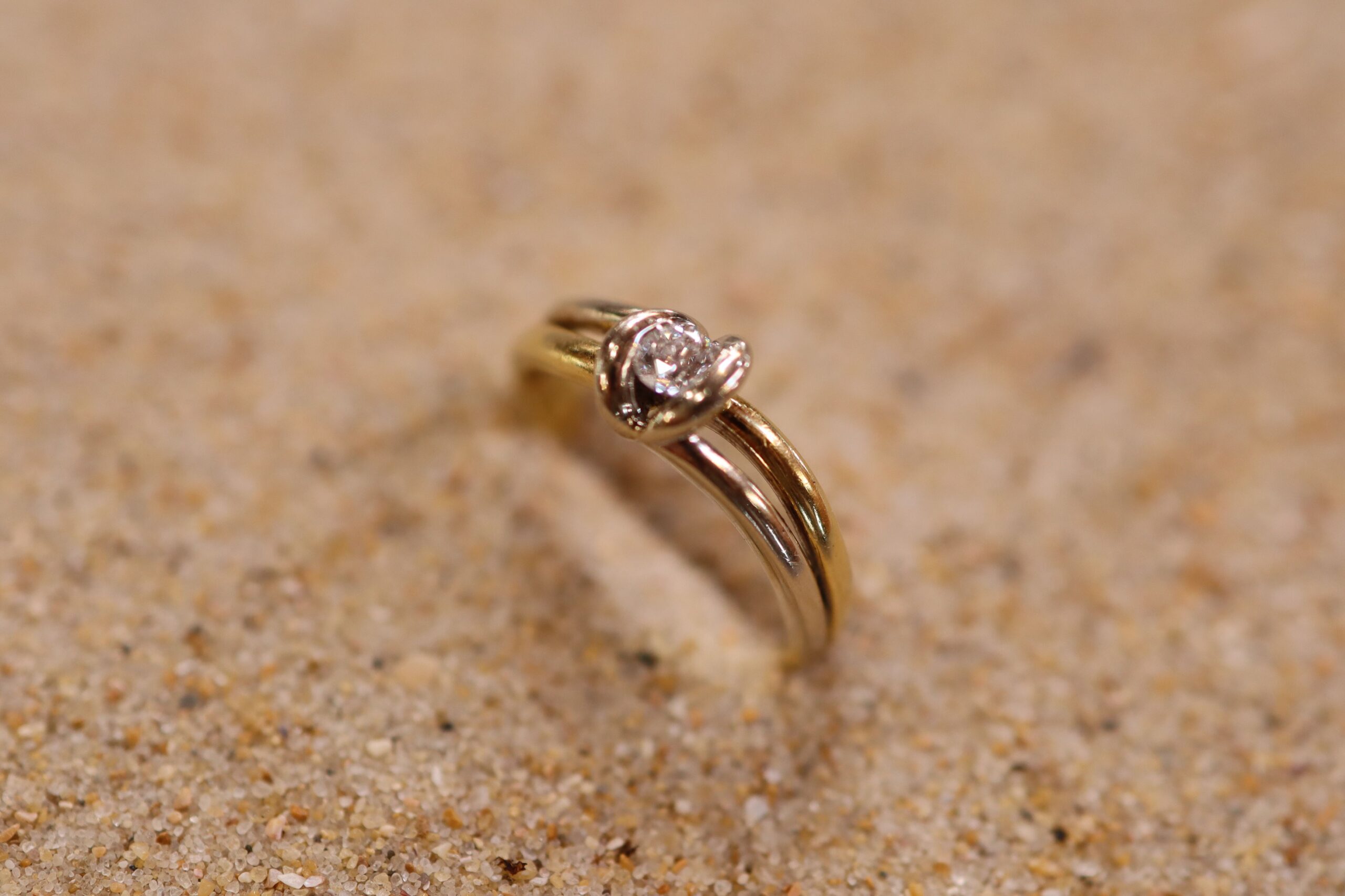 This Diamond Engagement Ring is set in 18ct Gold. It is a larger size S. It features two-tone gold; mostly yellow gold with white gold. The diamond diameter is 3mm, and the piece weighs 5.40g.