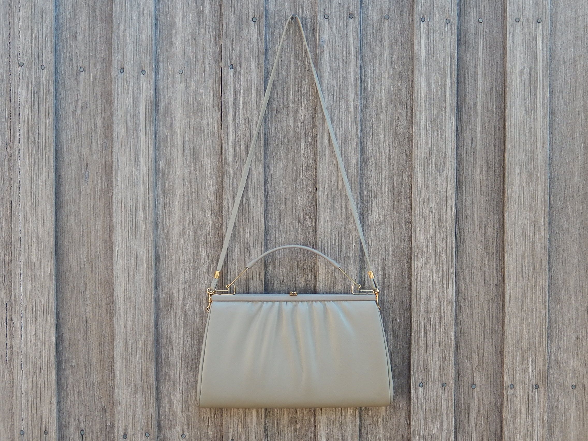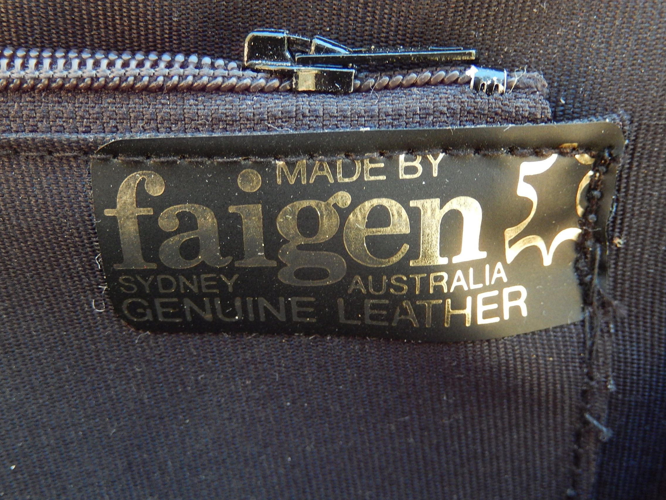 This designer hand bag made by Faigen in Sydney is made of warm grey pig skin leather. It has a removable shoulder strap and is 31cm across the base. It is in very good condition with no damage or staining.