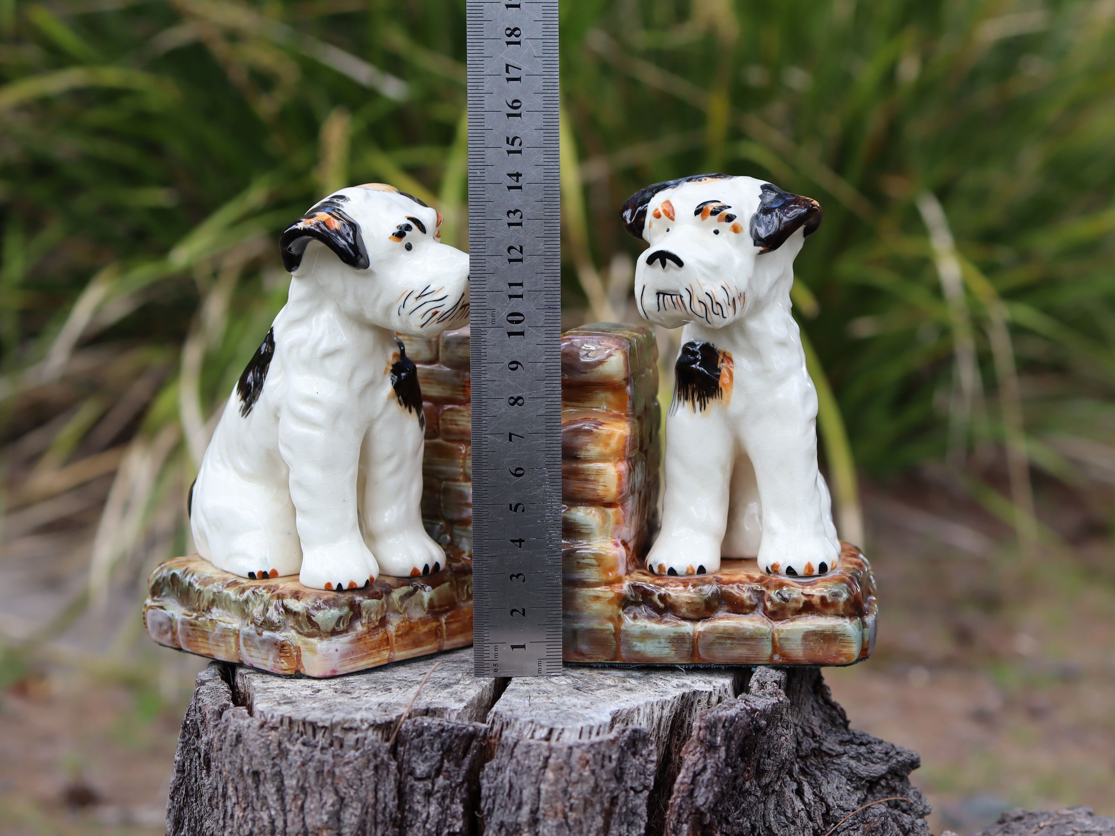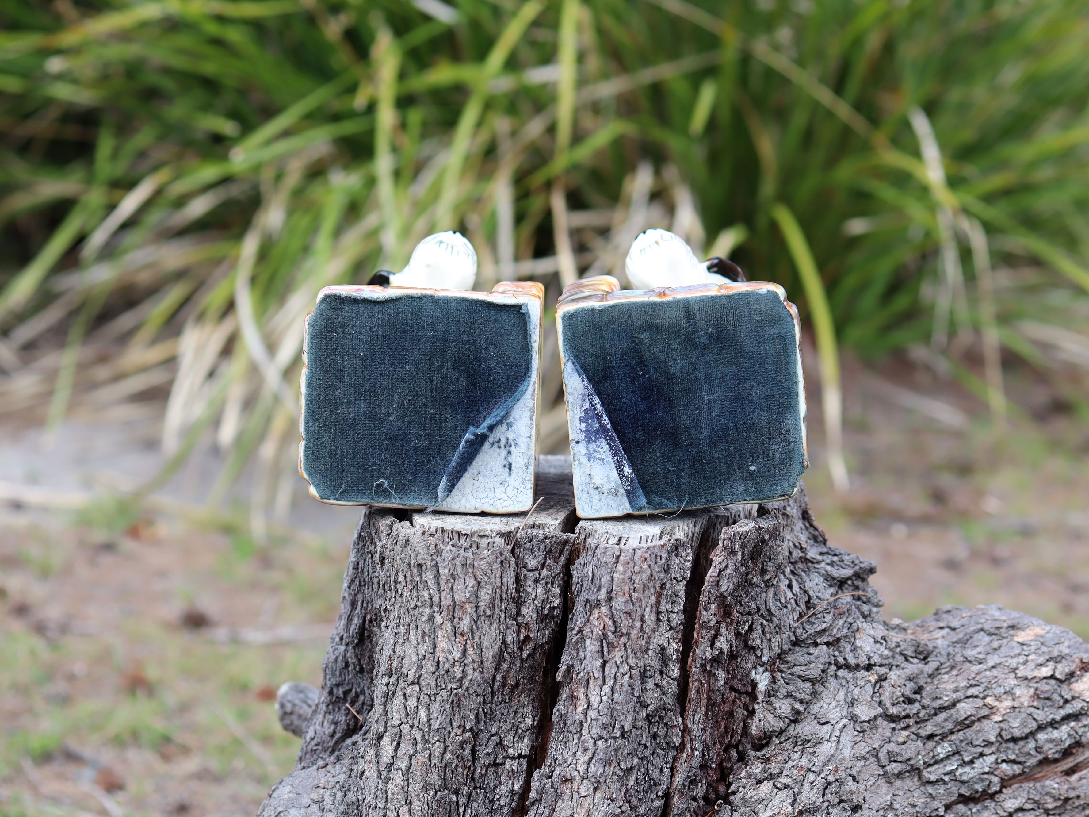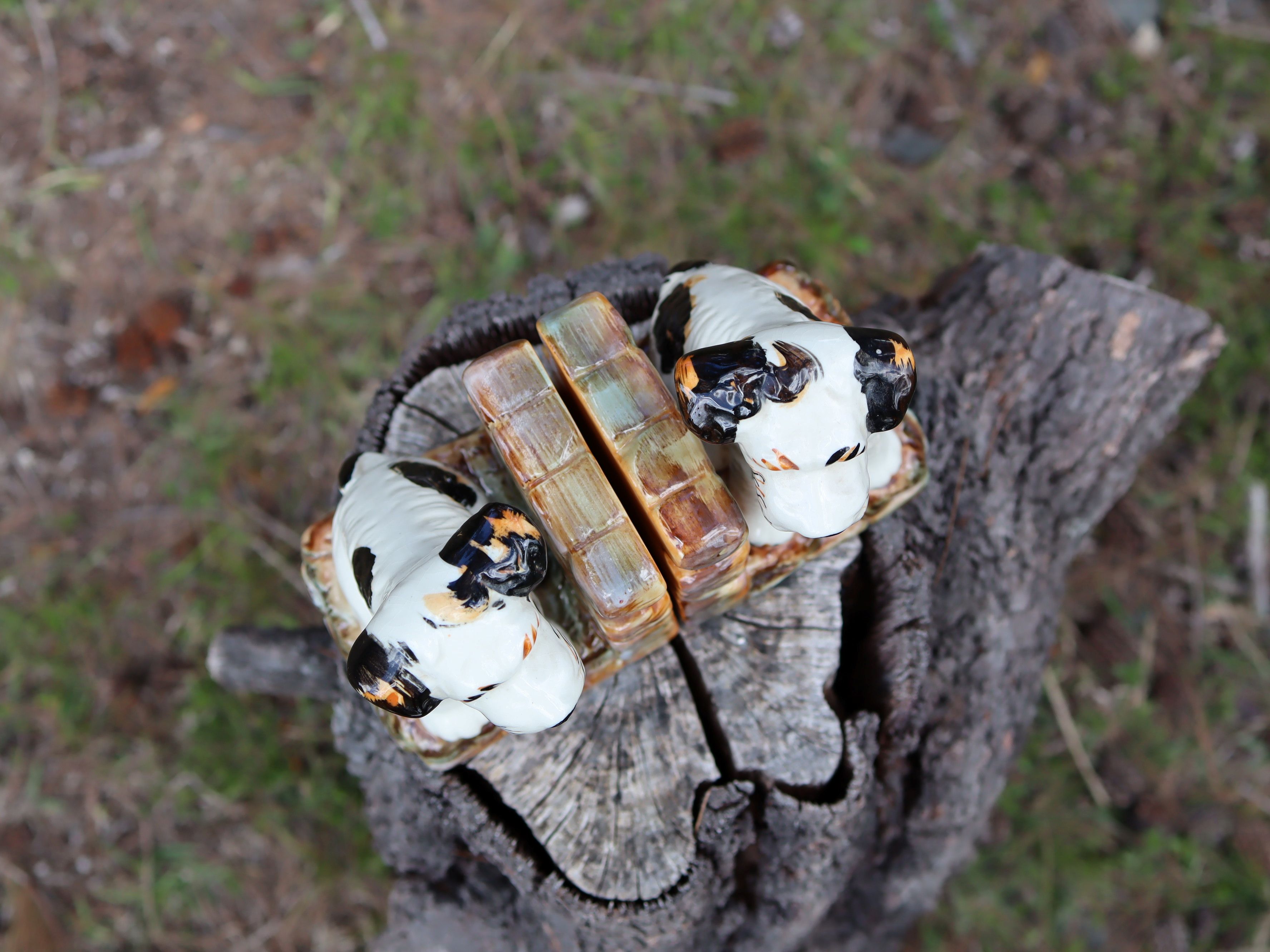 This hand-painted pair of c.1950 bookends features two very cute little puppies, each full of character and charm. They stand 14cm high, with bases approximately 9.5cm × 8.5cm, and weigh around 700g each. Sold as a pair, they are $95 in store and $115 online because of extra postage costs. A cheerful mid-century set that adds warmth and whimsy to any shelf.