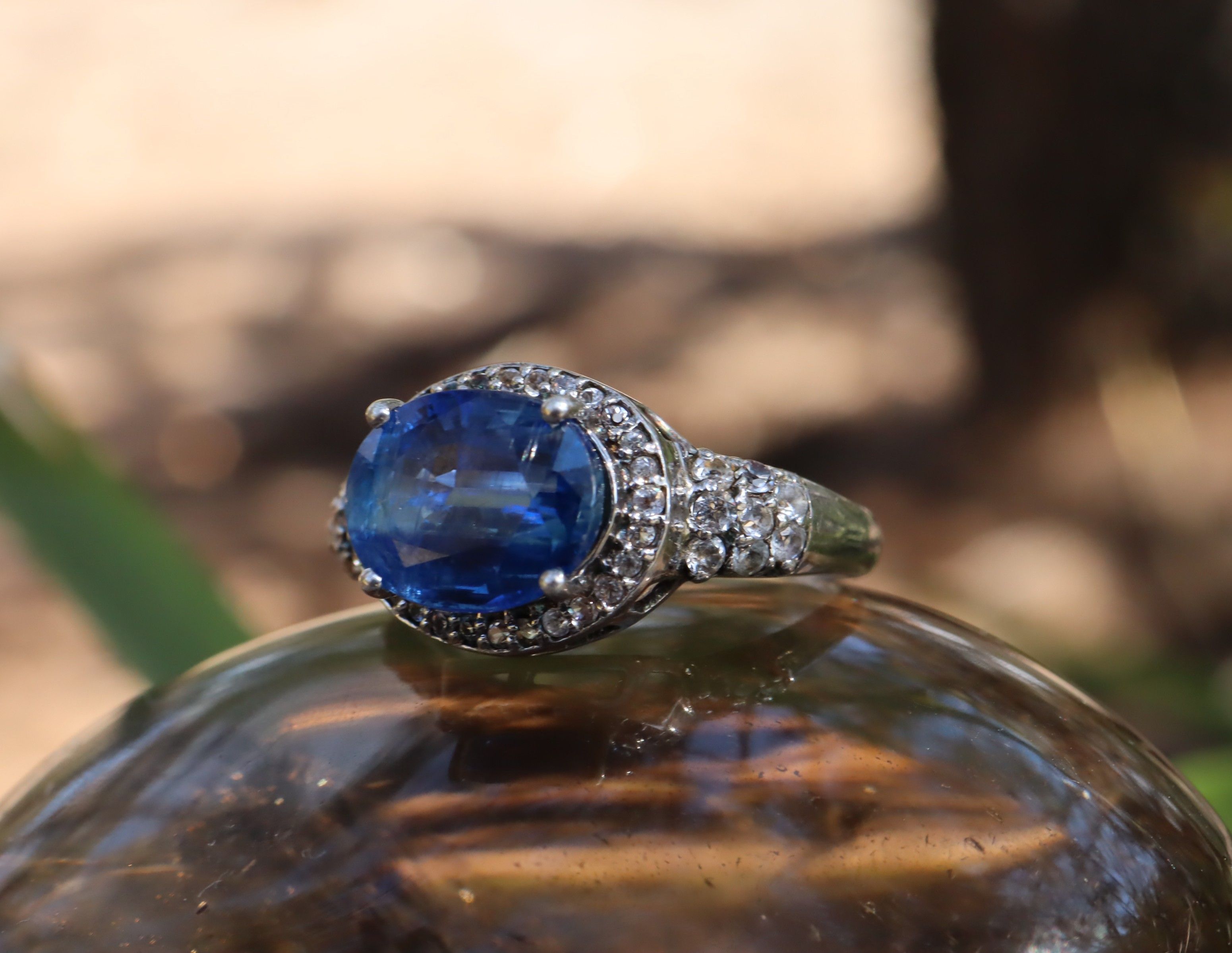 This sterling silver halo ring features a striking kyanite measuring 10 mm x 8 mm, surrounded by a sparkling halo of clear topaz, with additional topaz accenting the shoulders for extra sparkle. Size N and weighing 3.38g, it’s an elegant and eye-catching piece that combines the deep, shimmering blue of kyanite with the bright brilliance of topaz, perfect for adding a touch of colour and sophistication to any outfit.
