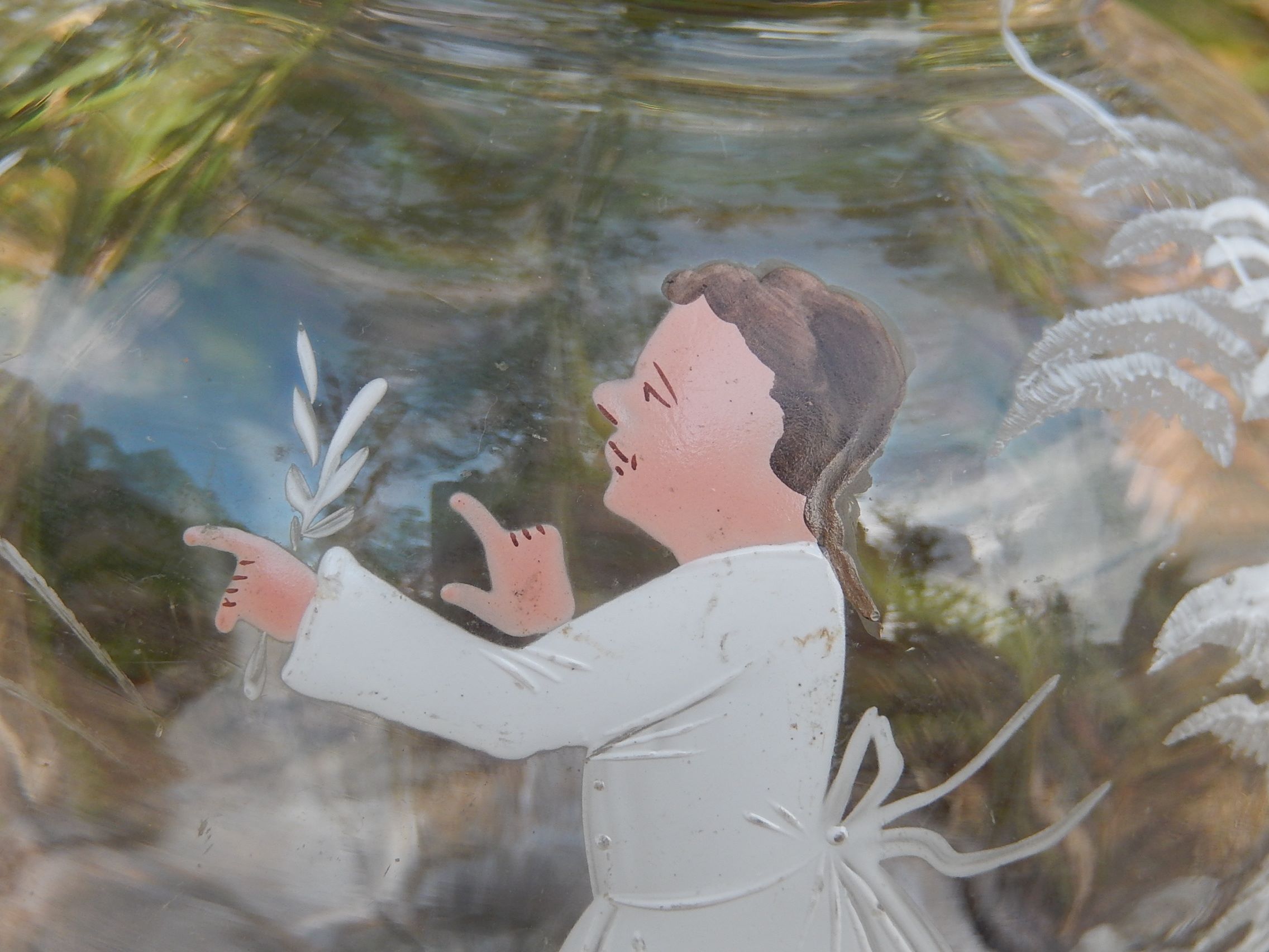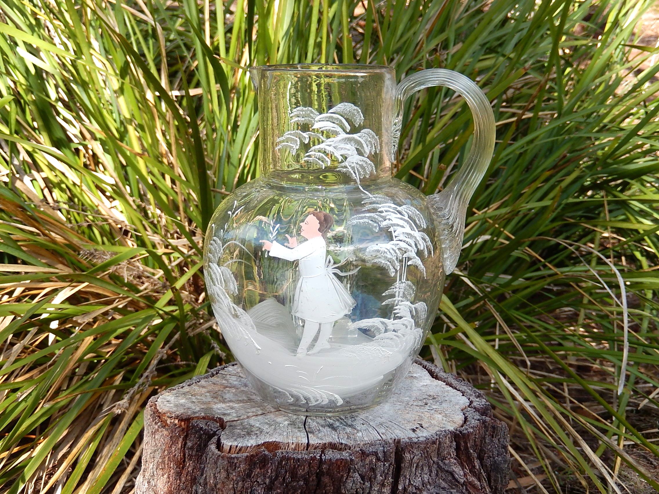 This Mary Gregory Glass Jug was made c.1900, and is 19.75cm high. It is in good condition for its age.