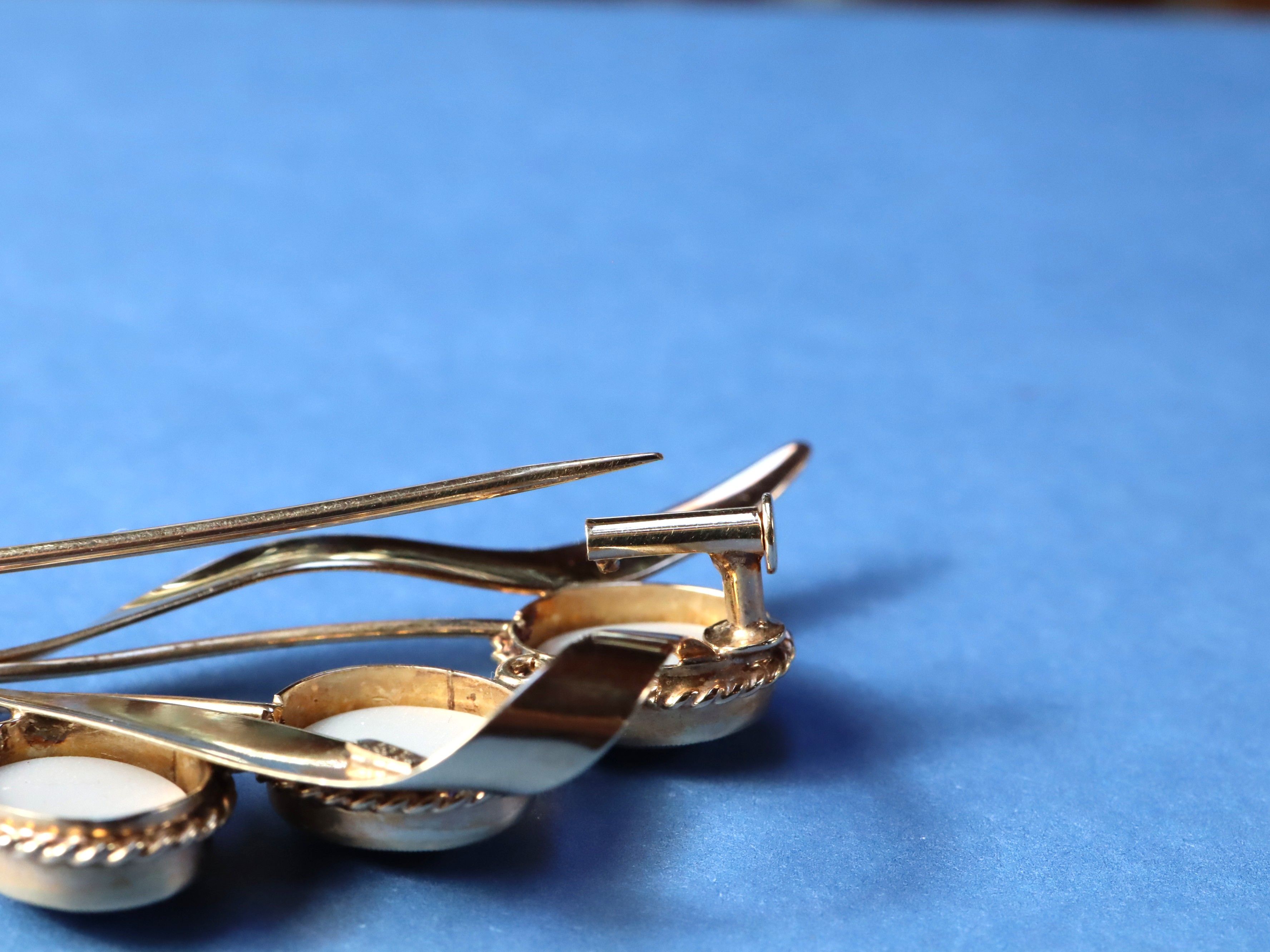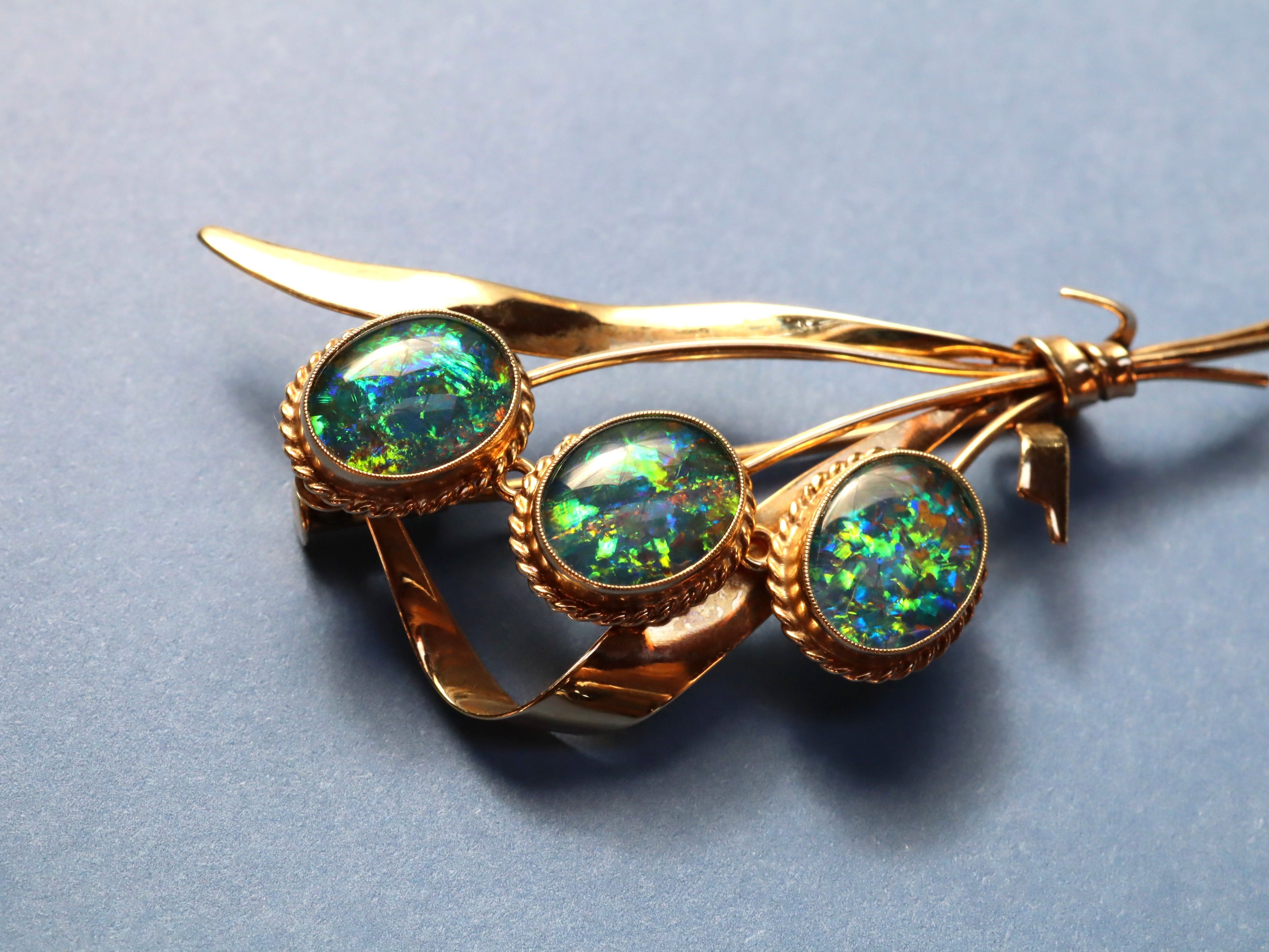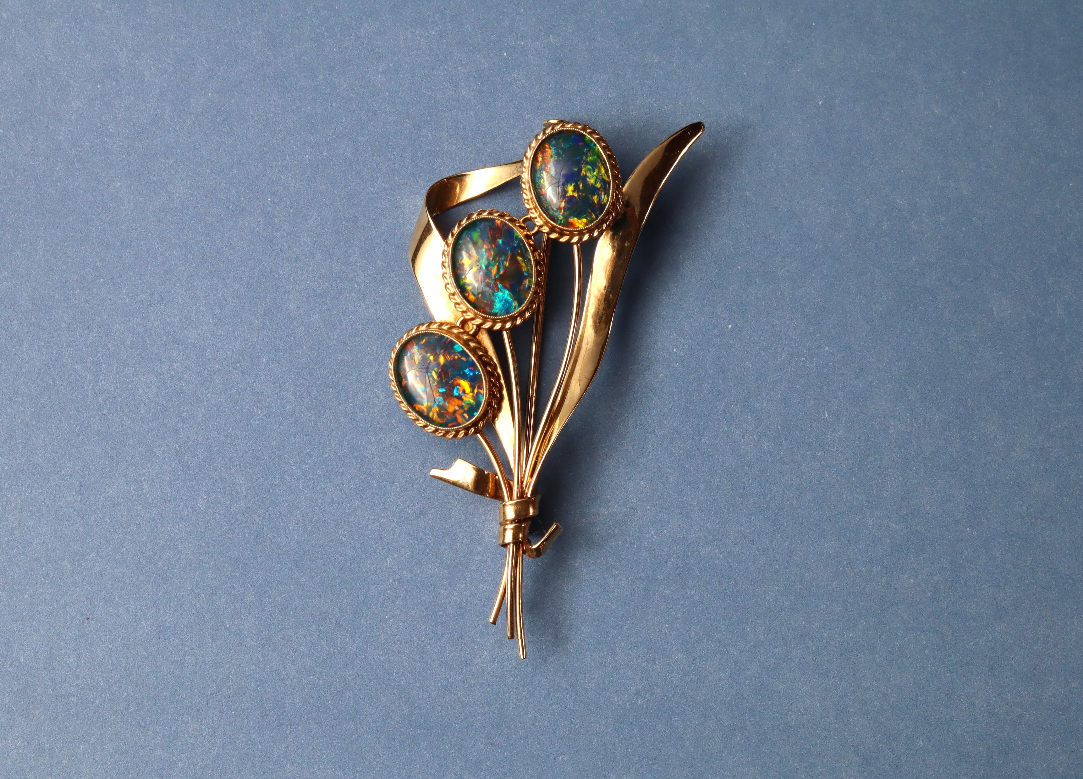 This opal doublet brooch in 16ct gold weighs 5.59g and is 5.5cm long, set with three opal doublets arranged in a floral-themed design. The opals display mesmerising flashes of red, blue, yellow, green, and orange, with the gold setting providing a warm frame that enhances the colour play. A graceful and expressive piece that captures the decorative charm of opal jewellery while remaining easy to wear or display.