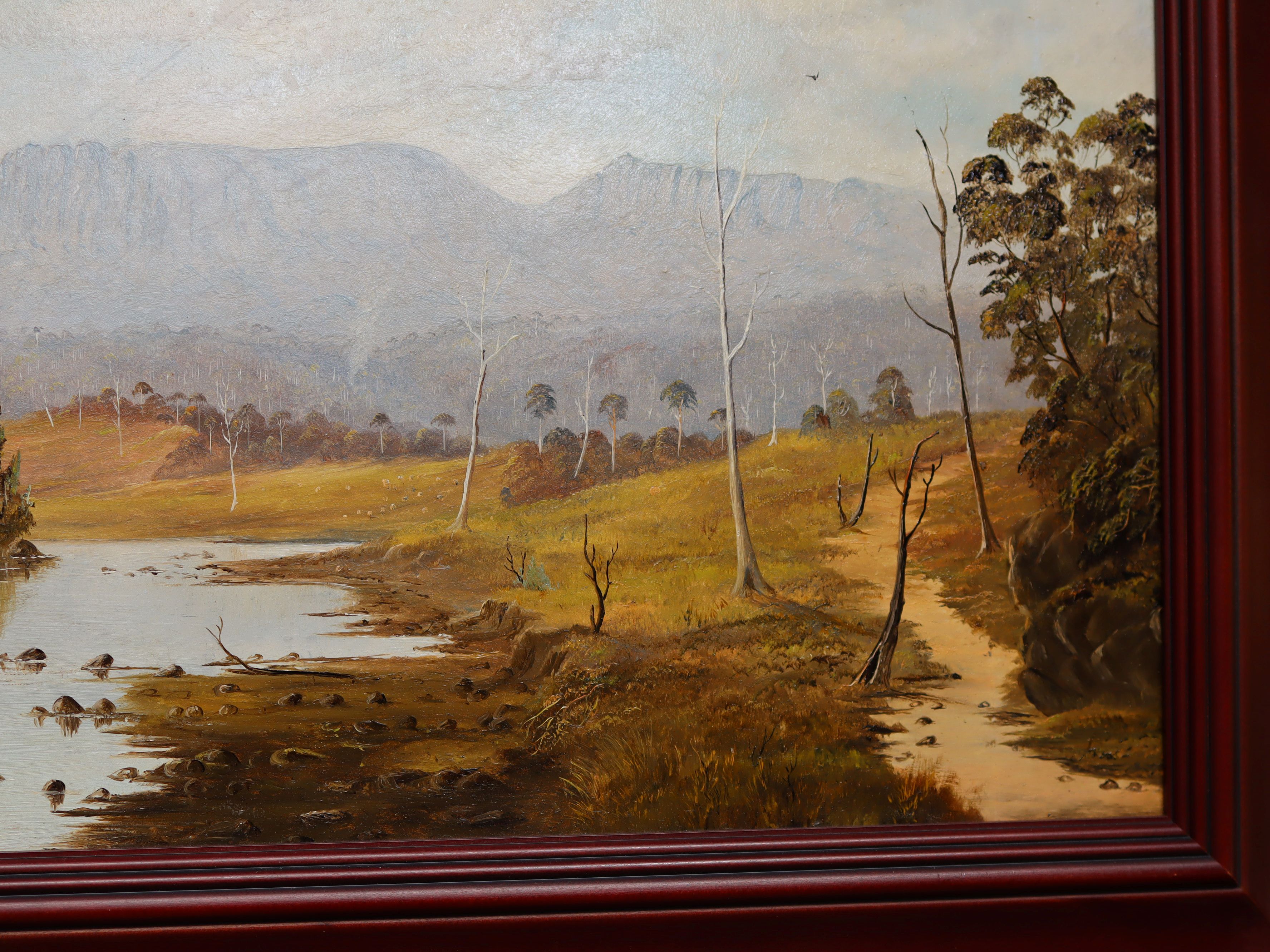 This original oil painting of Tasmanian mountains by C. McGregor captures the rugged beauty of Tasmania’s highlands. Measuring 41cm x 60cm, the piece is rendered in the colonial style, reflecting the 19th-century tradition of Australian landscape painting. The artist’s meticulous attention to detail and atmospheric use of light evoke the pioneering spirit and art of early Australian artists.
