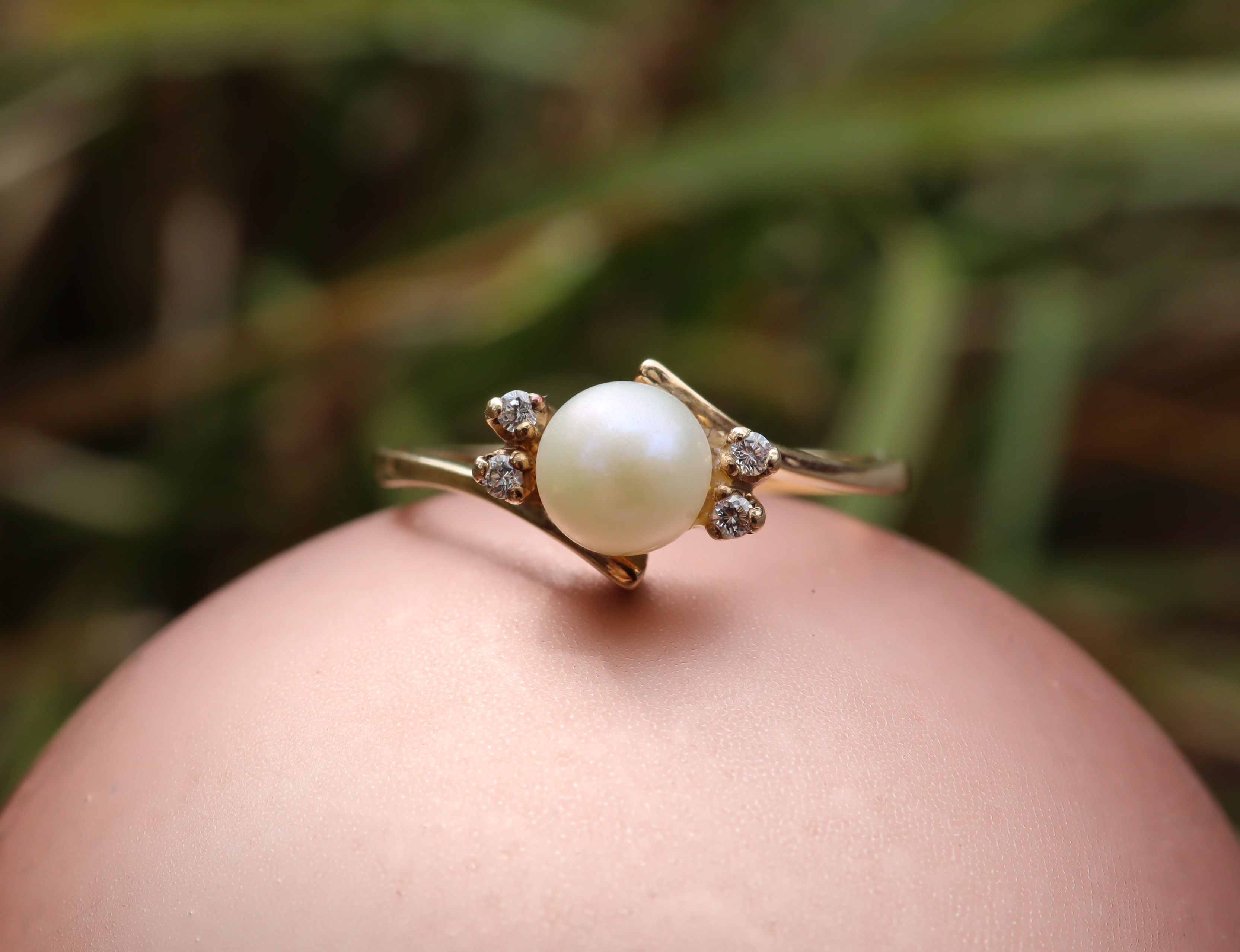 This pearl and crystal ring in 9ct gold is a larger size Q and weighs 2.17g, marked 9ct. It features a single 6mm pearl paired with four clear crystals in a graceful bypass design that gives the ring a sense of movement and lightness. The combination of the soft lustre of the pearl with the sparkle of the crystals creates a balanced, elegant look that sits comfortably on the hand without feeling heavy.