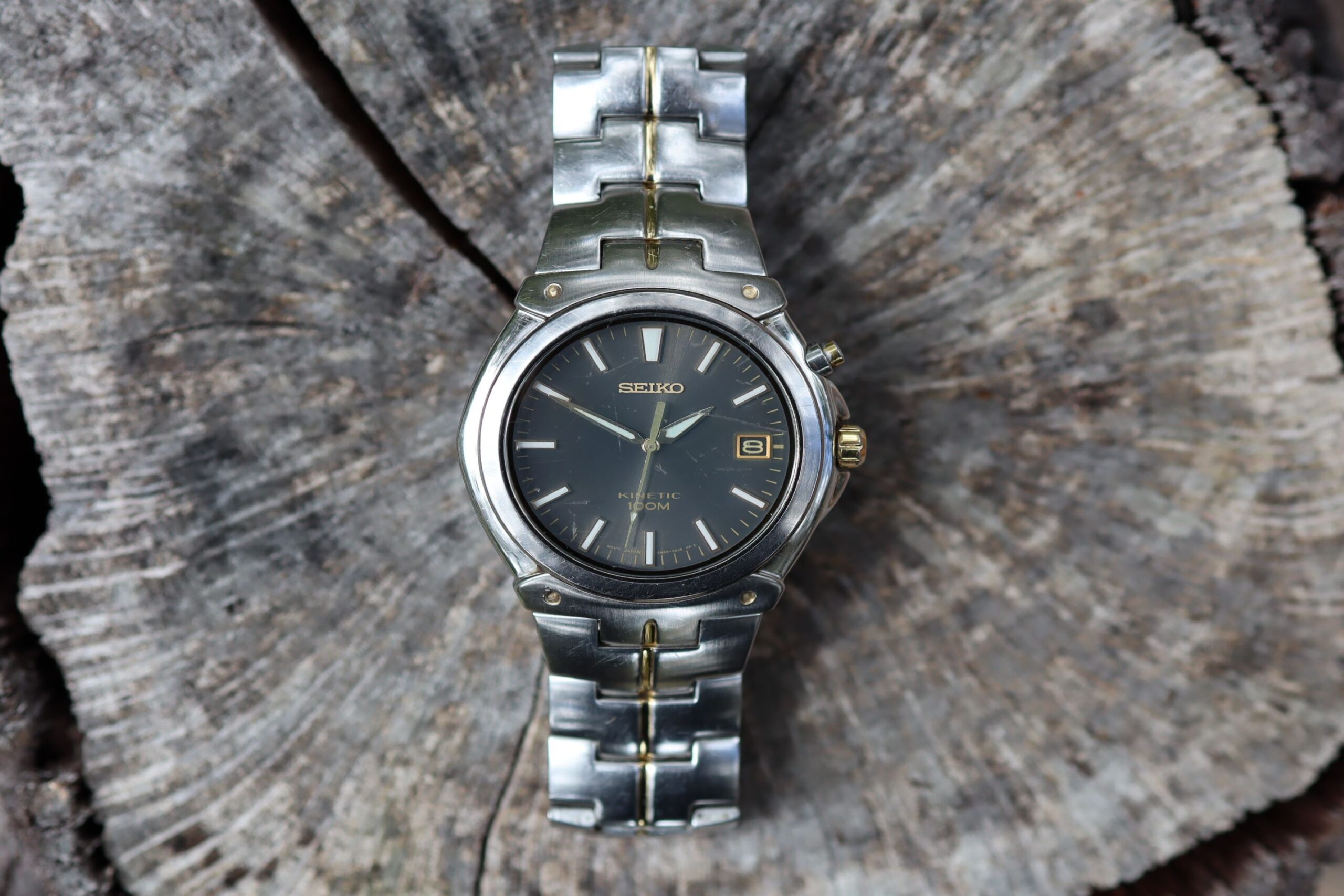 This lovely Seiko kinetic watch is water restistant to 100m. It will fit a wrist up to 18.5cm and is in full working condition.