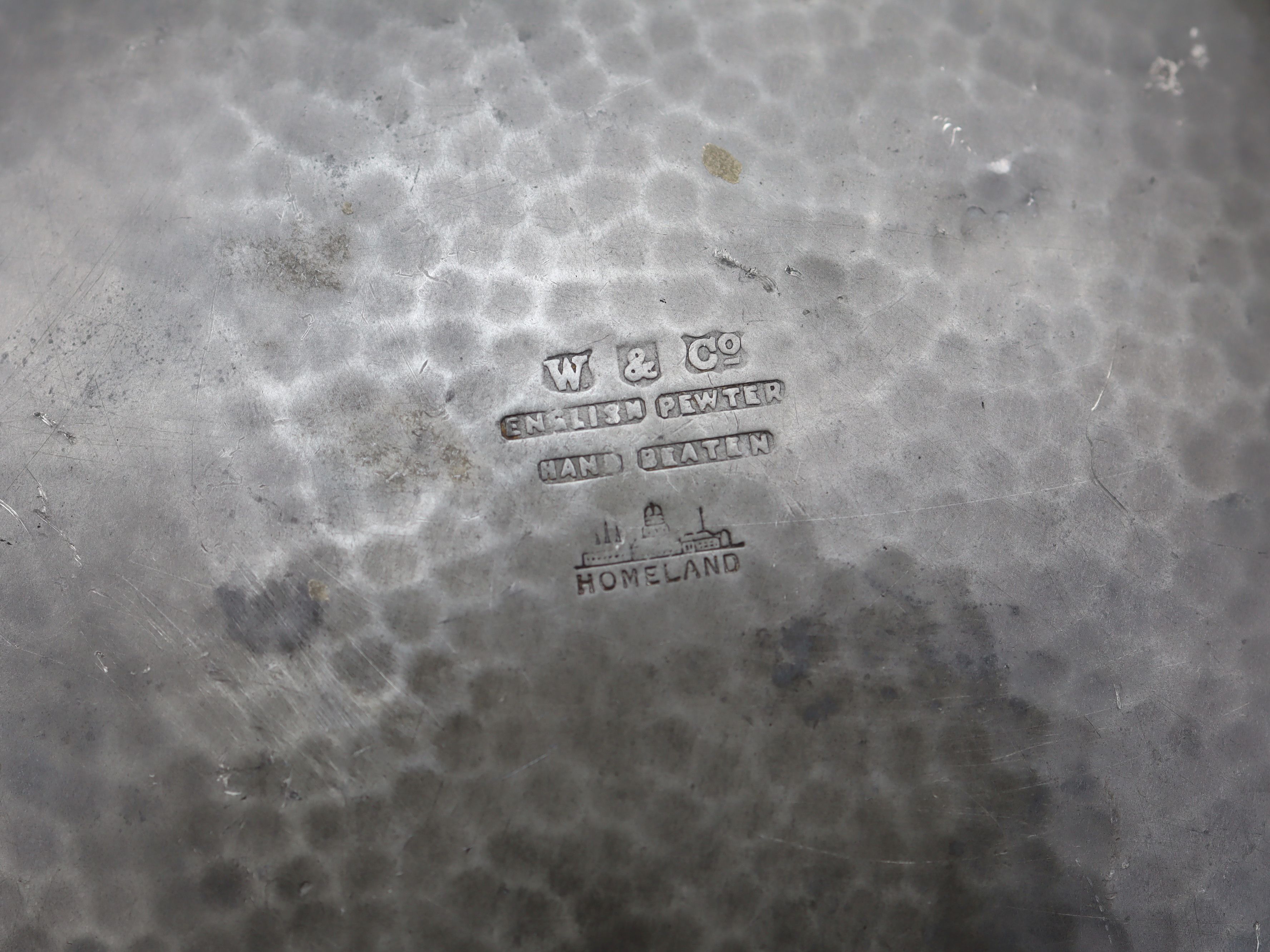 This Arts & Crafts pewter bowl by Walker & Company dates to around 1920 and is 20.5cm in diameter. Made in England, it is hand beaten with the honest, textured surface associated with the Arts & Crafts movement, which valued visible workmanship and simple, functional design. The bowl is stamped HOMELAND, a mark often used on English pewter of the period, and reflects the movement’s emphasis on traditional materials, skilled handwork, and understated form.