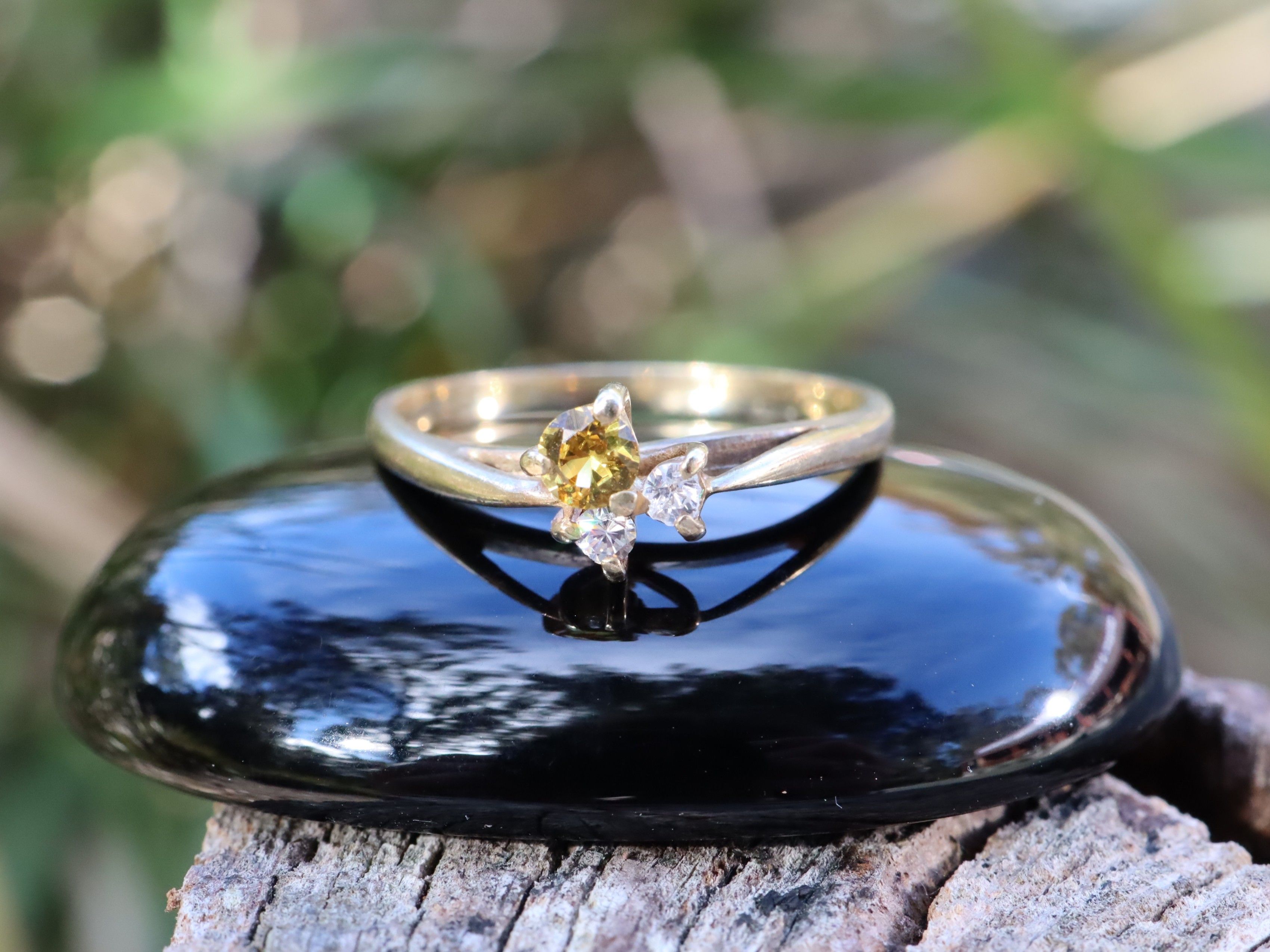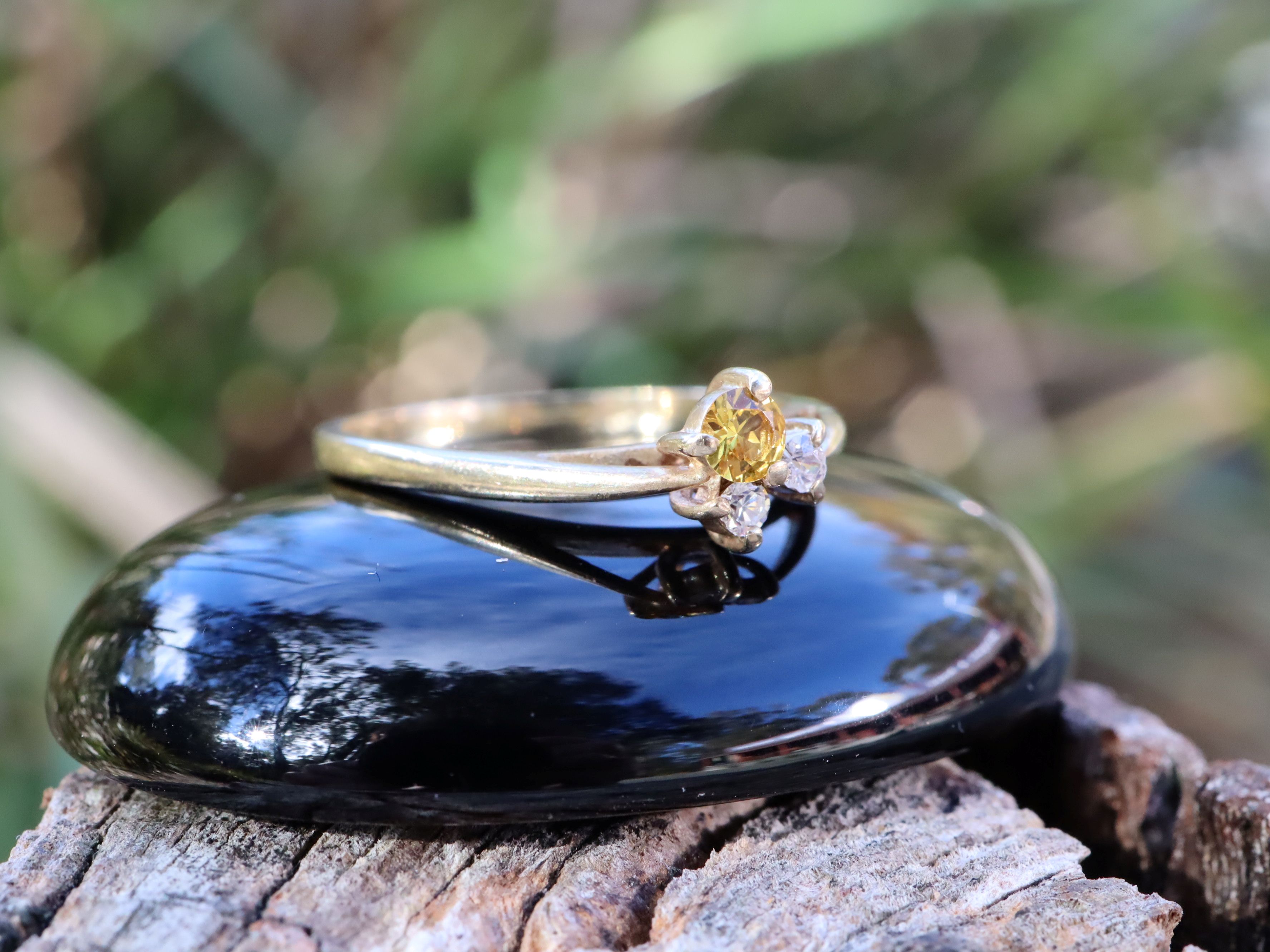 Yellow sapphire in 9ct gold ring, size L. This delicate piece weighs 1.56g and features a 2.5mm yellow sapphire flanked by two smaller white sapphires. Yellow sapphires are admired for their warm, golden hue and are traditionally associated with wisdom, prosperity, and joy. Their gentle sparkle makes them a beautiful and meaningful choice for a ring that is both elegant and understated.
